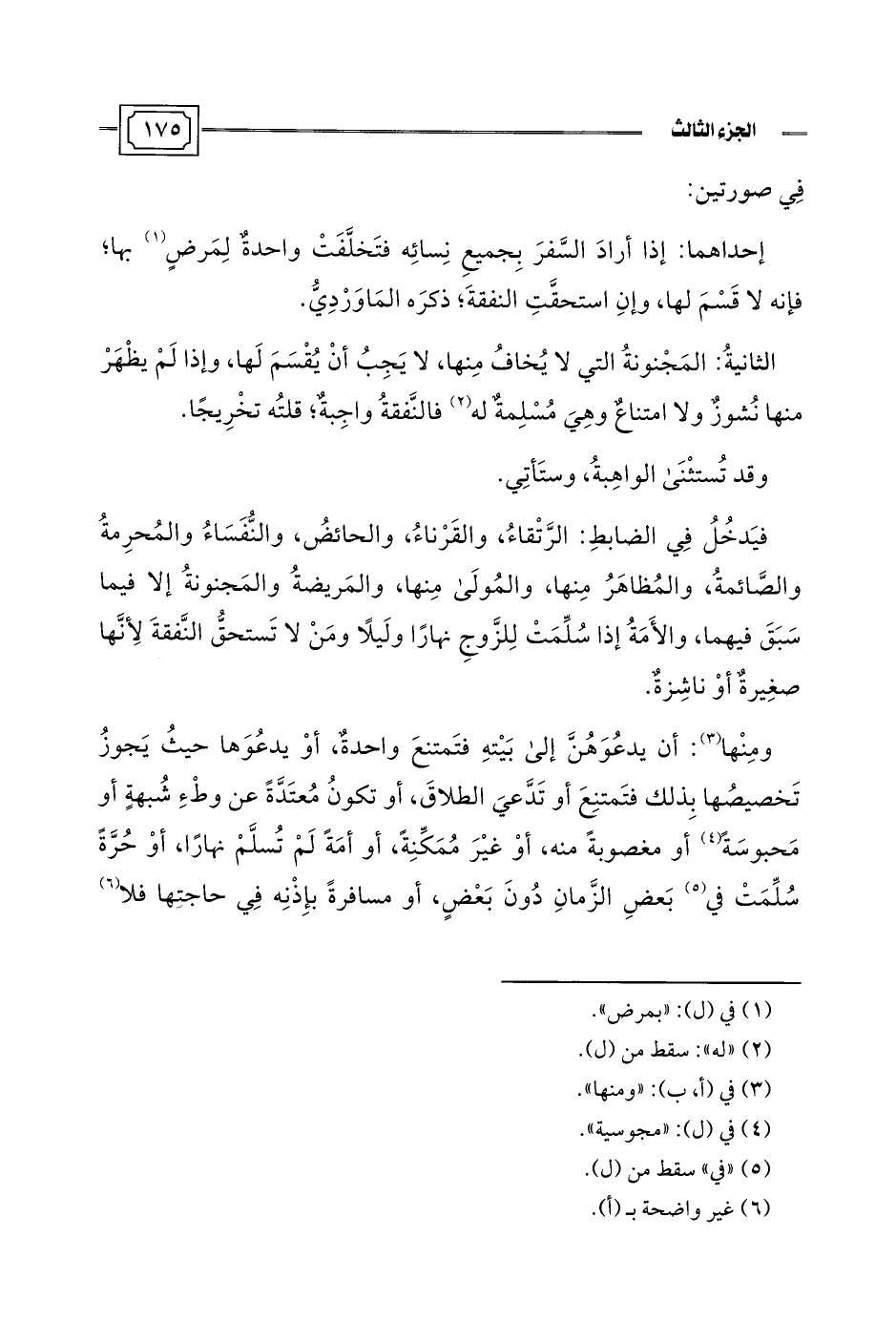 الثانيةُ: المَجْنونةُ التي لا يُخافُ مِنها، لا يَجِبُ أَنْ يُقْسَمَ لَها، وإذا لَمْ يظْهَرْ منها نُشوزٌ ولا امتناعٌ وهِيَ مُسْلِمةٌ له (¬2) فالنَّفقةُ واجِبةٌ؛ قلتُه تخْرِيجًا.