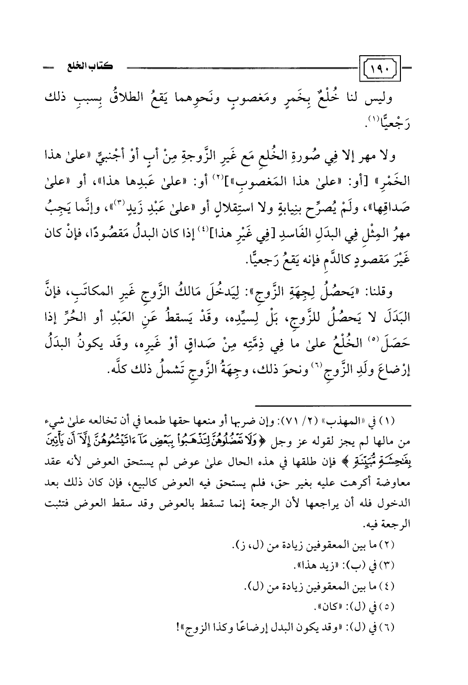 ولا مهر إلا فِي صُورةِ الخُلعِ مَع غَيرِ الزَّوجةِ مِنْ أبٍ أوْ أجْنبيٍّ "على هذا الخَمْرِ" [أو: "على هذا المَغصوبِ"] (¬2) أو: "على عَبدِها هذا"، أو "على صَداقِها"، ولَمْ يُصرِّح بنِيابةٍ ولا استِقلالٍ أو "على عَبْدِ زَيدٍ (¬3) "، وإنَّما يَجِبُ مهرُ المِثْلِ فِي البدَلِ الفَاسدِ [فِي غَيْرِ هذا] (¬4) إذا كان البدلُ مَقصُودًا، فإنْ كان غَيْرَ مَقصودٍ كالدَّمِ فإنه يَقعُ رَجعيًّا.