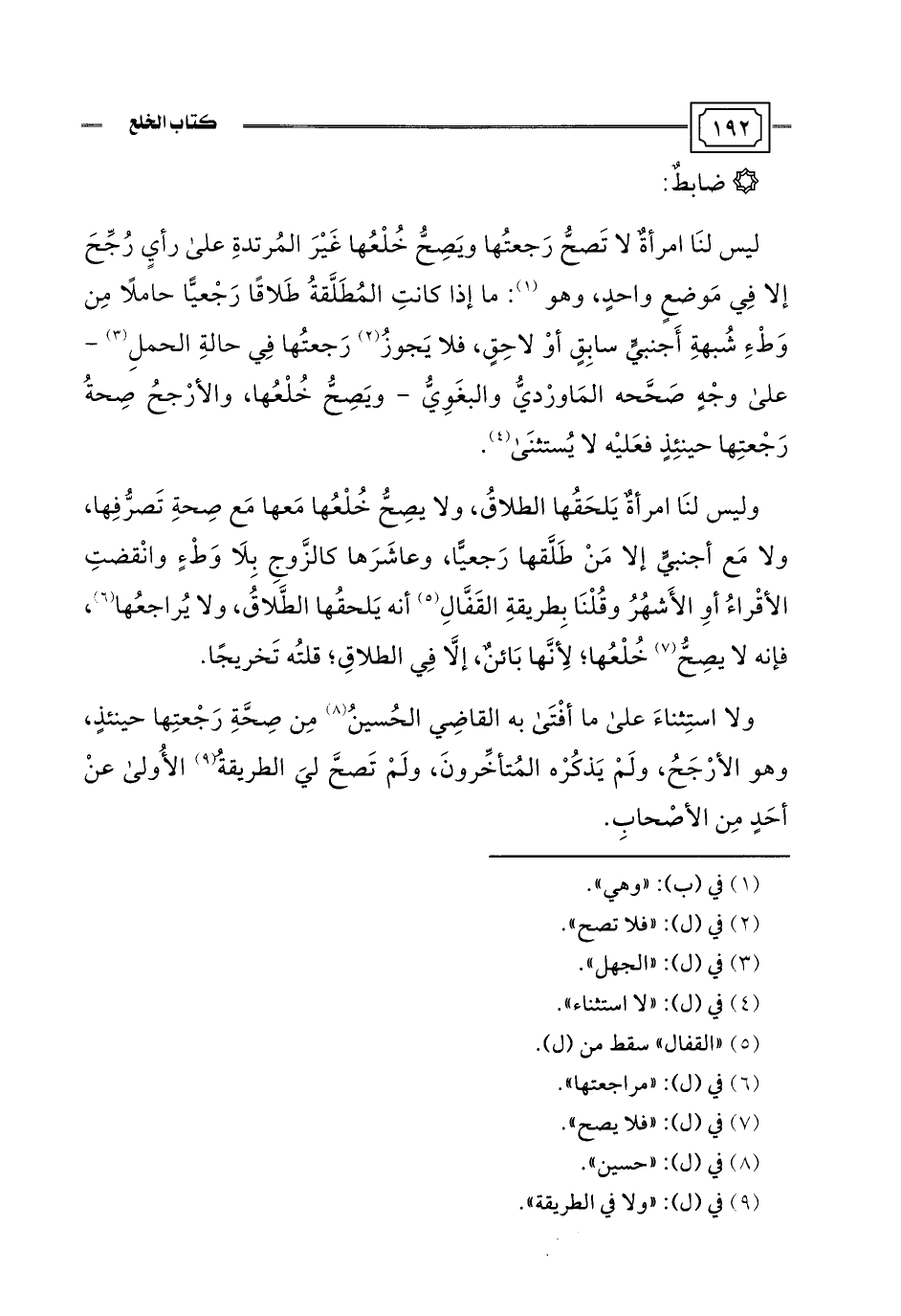 ليس لنَا امرأةٌ لا تَصحُّ رَجعتُها ويَصِحُّ خُلْعُها غَيْرَ المُرتدةِ على رأيٍ رُجِّحَ إلا فِي مَوضعٍ واحدٍ، وهو (¬1): ما إذا كانتِ المُطَلَّقةُ طَلاقًا رَجْعيًّا حاملًا مِن وَطْءِ شُبهةِ أَجنبيٍّ سابِقٍ أوْ لاحِقٍ، فلا يَجوزُ (¬2) رَجعتُها فِي حالةِ الحملِ (¬3) -على وجْهٍ صَحَّحه المَاورْديُّ والبغَوِيُّ- ويَصِحُّ خُلْعُها، والأرْجحُ صِحةُ رَجْعتِها حينئِذٍ فعَليْه لا يُستثنَى (¬4).