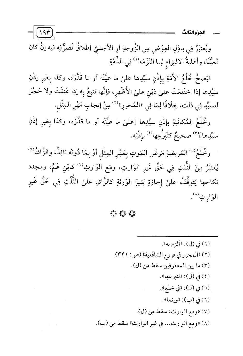 وخُلْعُ (¬5) المَريضةِ مَرضَ المَوتِ بِمَهْرِ المِثْلِ أوْ بِمَا دُونَه نافِذٌ، والزَّائدُ (¬6) يُعتبَرُ مِنَ الثُّلثِ فِي حَقِّ غَيرِ الوَارثِ، ومَع الوَارثِ (¬7) كابْنِ عَمٍّ، ومجدد نكاحها يَتوقَّفُ على إِجازةِ بَقيةِ الوَرثةِ كالزَّائدِ على الثُّلُثِ فِي حَقِّ غَيرِ الوَارِثِ (¬8).
