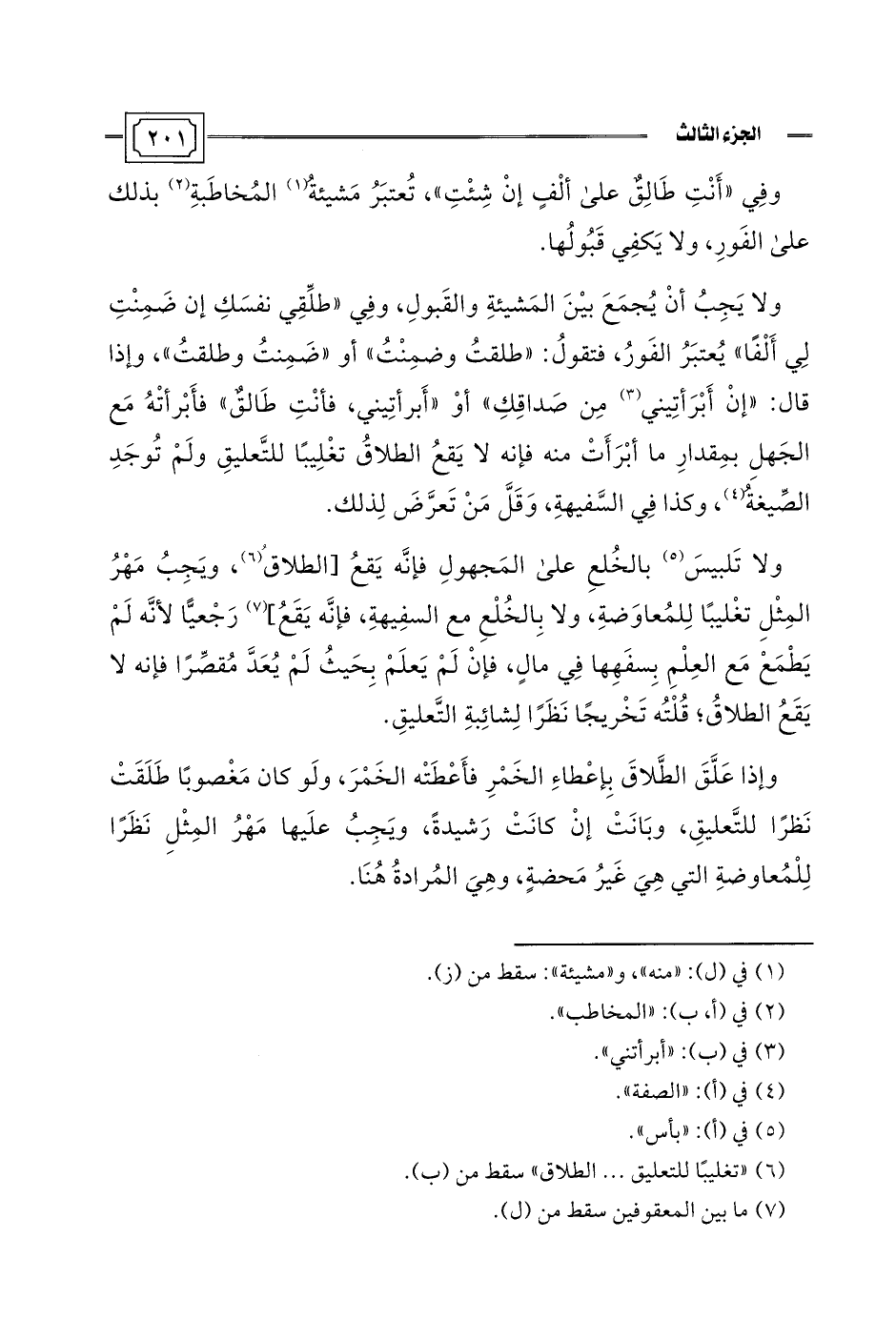 ولا يَجِبُ أَنْ يُجمَعَ بيْنَ المَشيئةِ والقَبولِ، وفِي "طلِّقِي نفسَكِ إن ضمِنْتِ لِي أَلْفًا" يُعتبَرُ الفَورُ، فتقولُ: "طلقتُ وضمِنْتُ" أو "ضَمِنتُ وطلقتُ"، وإذا قال: "إنْ أَبْرَأتِيني (¬3) مِن صَداقِكِ" أوْ "أَبرأتِيني، فأنْتِ طَالقٌ" فأَبْرأتْهُ مَع الجَهل بمِقدارِ ما أبْرَأَتْ منه فإنه لا يَقعُ الطلاقُ تغْلِيبًا للتَّعليقِ ولَمْ تُوجَدِ الصِّيغَةُ (¬4)، وكذا فِي السَّفيهةِ، وَقَلَّ مَنْ تَعرَّضَ لِذلك.