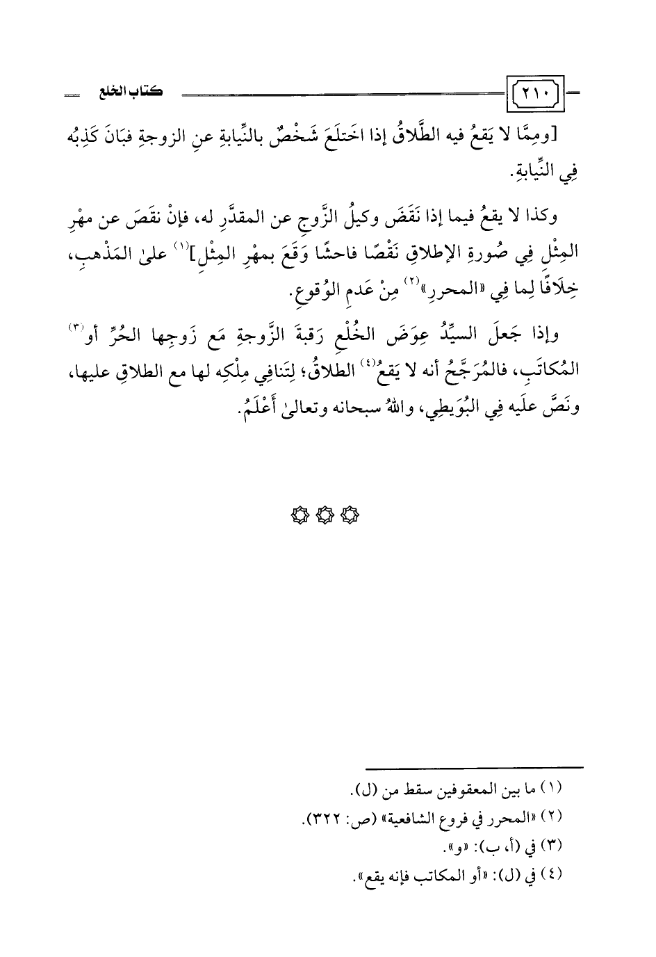 وإذا جَعلَ السيِّدُ عِوَضَ الخُلْعِ رَقبةَ الزَّوجةِ مَع زَوجِها الحُرِّ أو (¬3) المُكاتَبِ، فالمُرَجَّحُ أنه لا يَقعُ (¬4) الطلاقُ، لِتَنافِي مِلْكِه لها مع الطلاقِ عليها، ونَصَّ علَيه فِي البُويَطِي، واللَّهُ سبحانه وتعالى أَعْلَمُ.