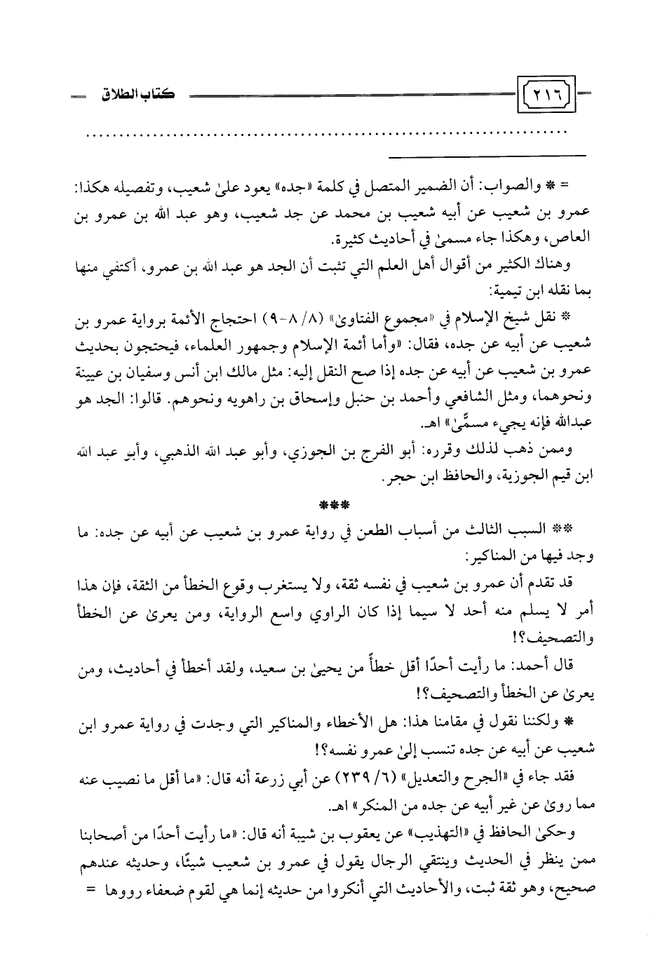 * نقل شيخ الإسلام في "مجموع الفتاوي" (8/ 8 - 9) احتجاج الأئمة برواية عمرو بن شعيب عن أبيه عن جده، فقال: "وأما أئمة الإسلام وجمهور العلماء، فيحتجون بحديث عمرو بن شعيب عن أبيه عن جده إذا صح النقل إليه: مثل مالك ابن أنس وسفيان بن عيينة ونحوهما، ومثل الشافعي وأحمد بن حنبل وإسحاق بن راهويه ونحوهم. قالوا: الجد هو عبد اللَّه فإنه يجيء مسمًّى" اهـ.