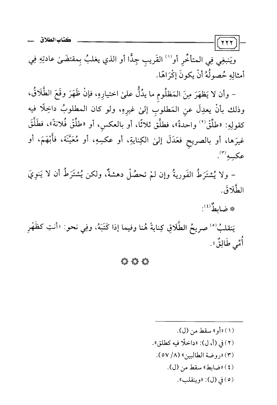 - وأن لا يَظهَرَ مِنَ المَظلُومِ ما يدُلُّ على اختيارِهِ، فإنْ ظَهَرَ وقَعَ الطَّلَاقُ، وذلك بأنْ يعدِلَ عنِ المَطلوبِ إلى غيرِهِ، ولو كان المطلوبُ داخِلًا فيه كقولِهِ: "طلِّقْ (¬2) واحدةً"، فطلَّق ثلاثًا، أو بالعكسِ، أو "طلِّقْ فُلانةً"، فطَلَّقَ غيرَها، أو بالصريحِ فعَدَلَ إلى الكِنايةِ، أو عكسِهِ، أو مُعَيَّنَة، فأَبْهَمَ، أو عكسِهِ (¬3).