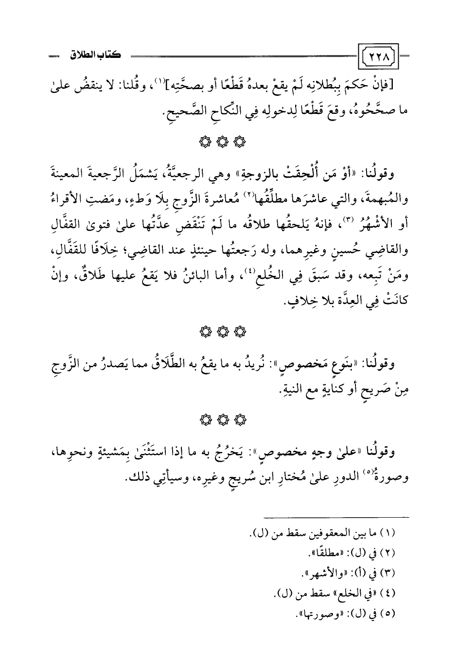 وقولُنا: "بنَوعٍ مَخصوصٍ": نُريدُ به ما يقعُ به الطَّلَاقُ مما يَصدرُ من الزَّوجِ مِنْ صَريحٍ أو كنايةٍ مع النيةِ.