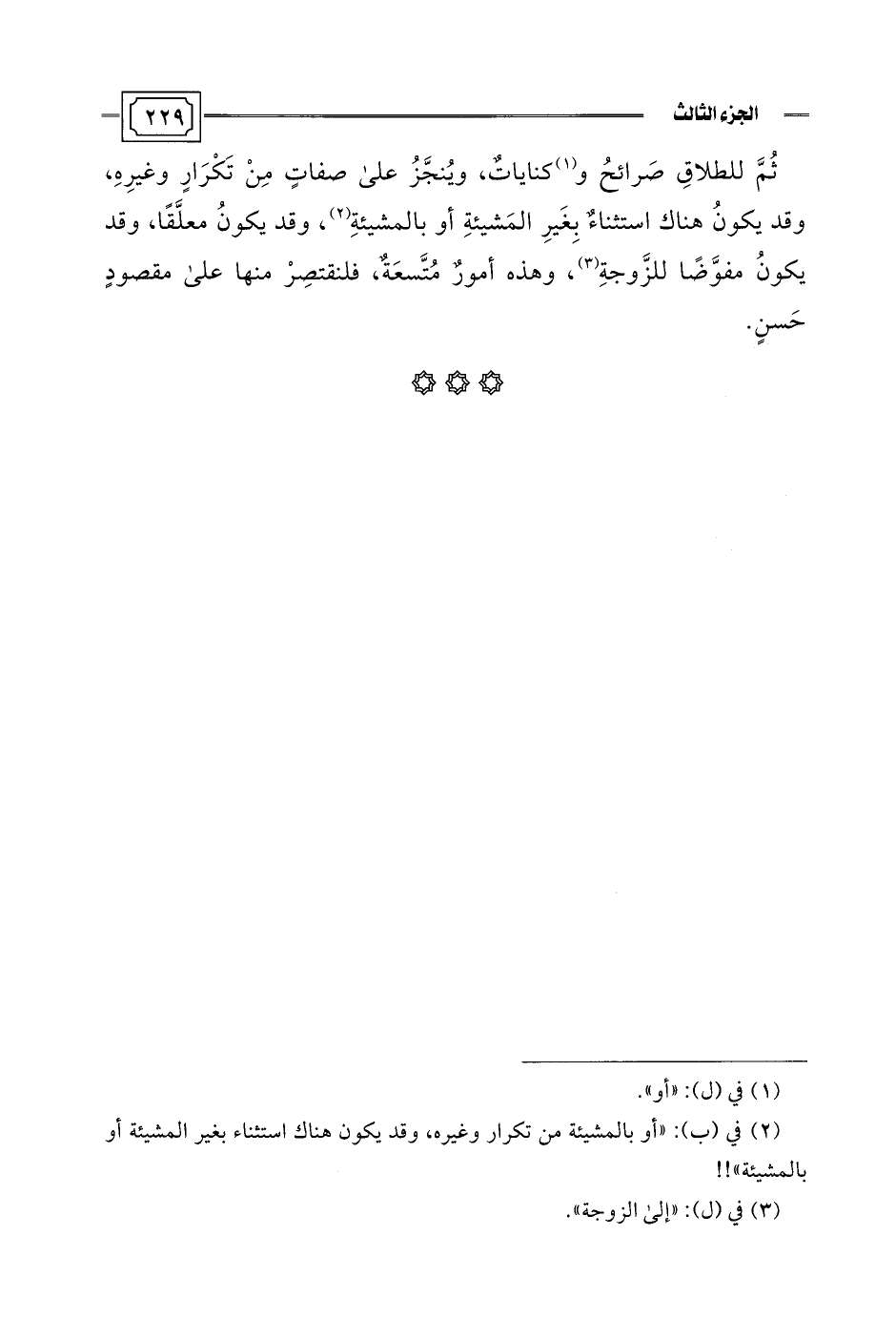 ثُمَّ للطلاقِ صَرائحُ و (¬1) كناياتٌ، ويُنجَّزُ على صفاتٍ مِنْ تَكْرَارٍ وغيرِهِ، وقد يكونُ هناك استثناءٌ بِغَيرِ المَشيئةِ أو بالمشيئةِ (¬2)، وقد يكونُ معلَّقًا، وقد يكونُ مفوَّضًا للزَّوجةِ (¬3)، وهذه أمورٌ مُتَّسعَةٌ، فلنقتصِرْ منها على مقصودٍ حَسنٍ.