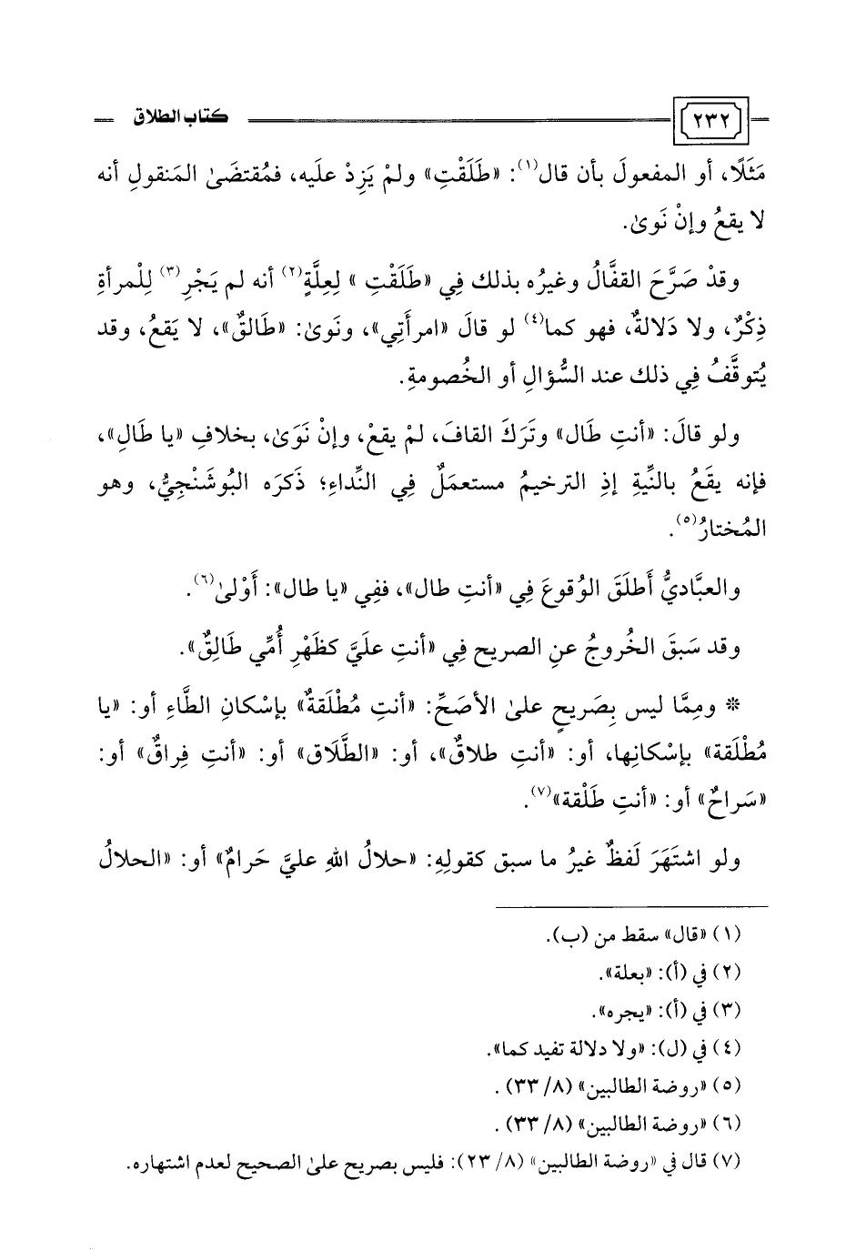 ولو قالَ: "أنتِ طَال" وتَرَكَ القافَ، لمْ يقعْ، وإنْ نَوَى، بخلافِ "يا طَالِ"، فإنه يقَعُ بالنِّيةِ إذِ الترخيمُ مستعمَلٌ فِي النِّداءِ، ذَكرَه البُوشَنْجِيُّ، وهو المُختارُ (¬5).