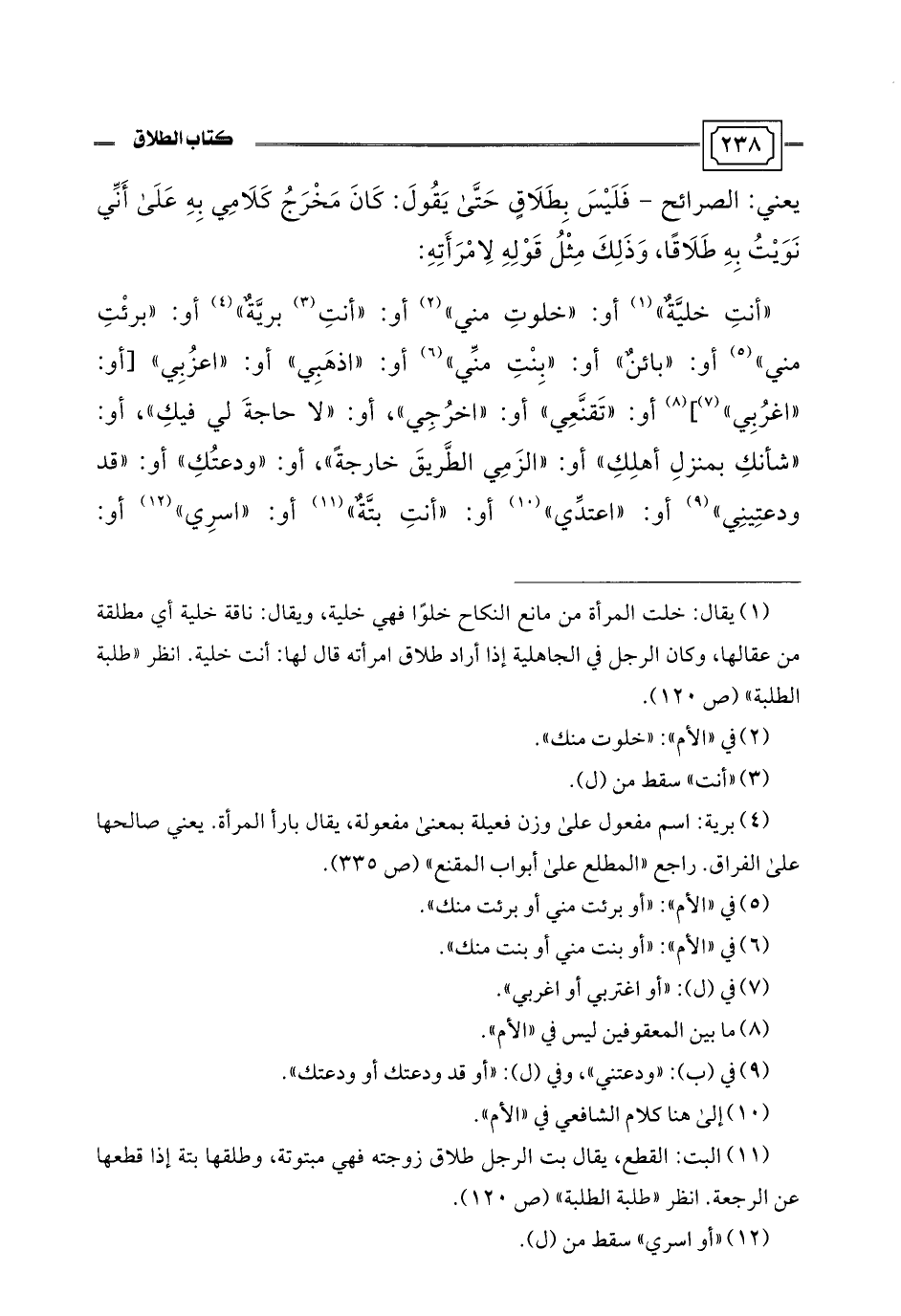 "أنتِ خليَّةٌ" (¬1) أو: "خلوتِ مني" (¬2) أو: "أنتِ (¬3) بريَّةٌ" (¬4) أو: "برئْتِ مني" (¬5) أو: "بائنٌ" أو: "بِنْتِ منِّي" (¬6) أو: "اذهَبِي" أو: "اعزُبِي" [أو: "اغرُبِي" (¬7)] (¬8) أو: "تَقنَّعِي" أو: "اخرُجِي"، أو: "لا حاجةَ لي فيكِ"، أو: "شأنكِ بمنزلِ أهلِكِ" أو: "الزَمِي الطَّريقَ خارجةً"، أو: "ودعتُكِ" أو: "قد ودعتِينِي" (¬9) أو: "اعتدِّي" (¬10) أو: "أنتِ بتَّةٌ" (¬11) أو: "اسرِي" (¬12) أو: