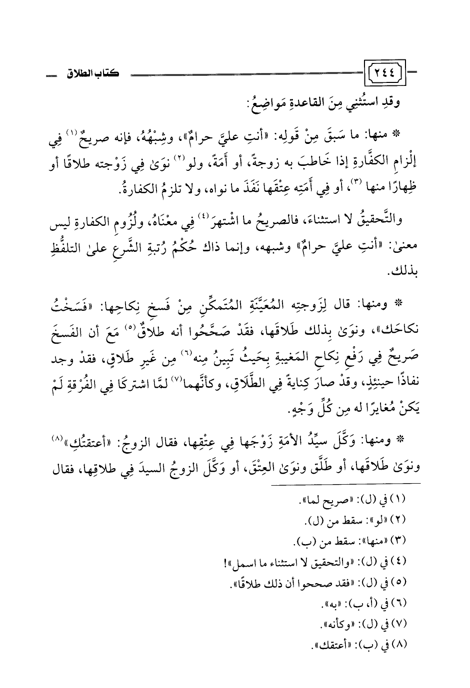 والتَّحقيقُ لا استثناءَ، فالصريحُ ما اشْتهرَ (¬4) فِي معْنَاهُ، ولُزُومِ الكفارةِ ليس معنى: "أنتِ عليَّ حرامٌ" وشبهه، وإنما ذاك حُكْمُ رُتبةِ الشَّرعِ على التلفُّظِ بذلك.