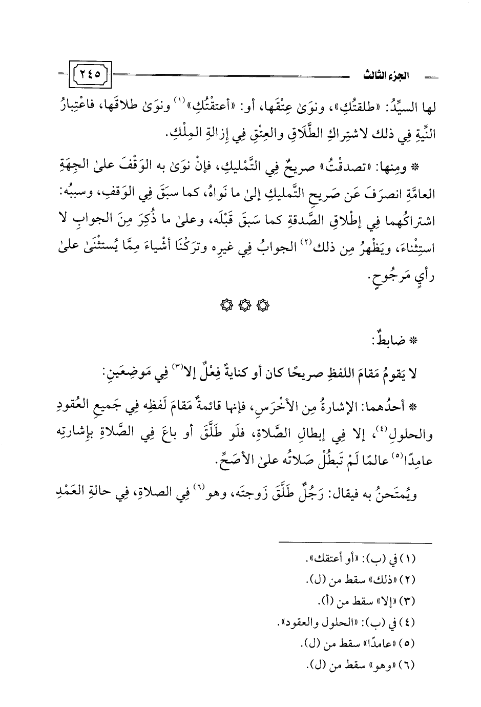 * ومِنها: "تصدقْتُ" صريحٌ فِي التَّمْليكِ، فإنْ نوَى به الوَقْفَ على الجِهَةِ العامَّةِ انصرَفَ عَن صَريحِ التَّمليكِ إلى ما نَواهُ، كما سبَقَ فِي الوَقفِ، وسببُه: اشتراكُهما فِي إطْلاقِ الصدقةِ كما سَبقَ قَبْلَه، وعلى ما ذُكِرَ مِنَ الجوابِ لا استِثْناءَ، ويَظْهرُ مِن ذلك (¬2) الجوابُ فِي غيرِه وترَكْنَا أشْياءَ مِمَّا يُستثْنَى على رأيٍ مَرجُوحٍ.