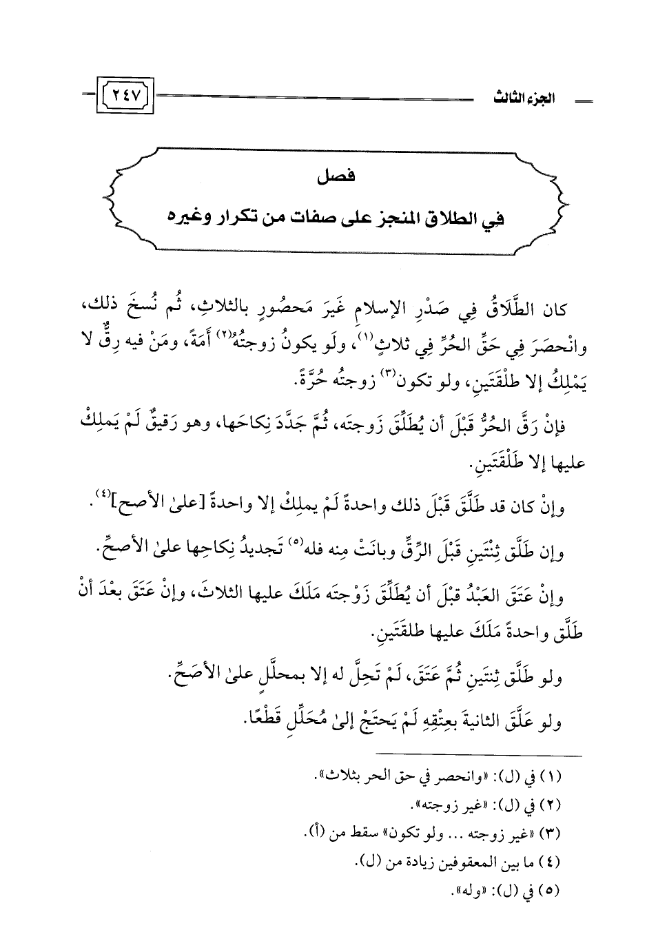 كان الطَّلَاقُ فِي صَدْرِ الإسلامِ غَيرَ مَحصورٍ بالثلاثِ، ثُم نُسخَ ذلك، وانْحصَرَ فِي حَقِّ الحُرِّ فِي ثلاثٍ (¬1)، ولَو يكونُ زوجتُهُ (¬2) أَمَةً، ومَنْ فيه رِقٌّ لا يَمْلِكُ إلا طلْقَتَينِ، ولو تكون (¬3) زوجتُه حُرَّةً.