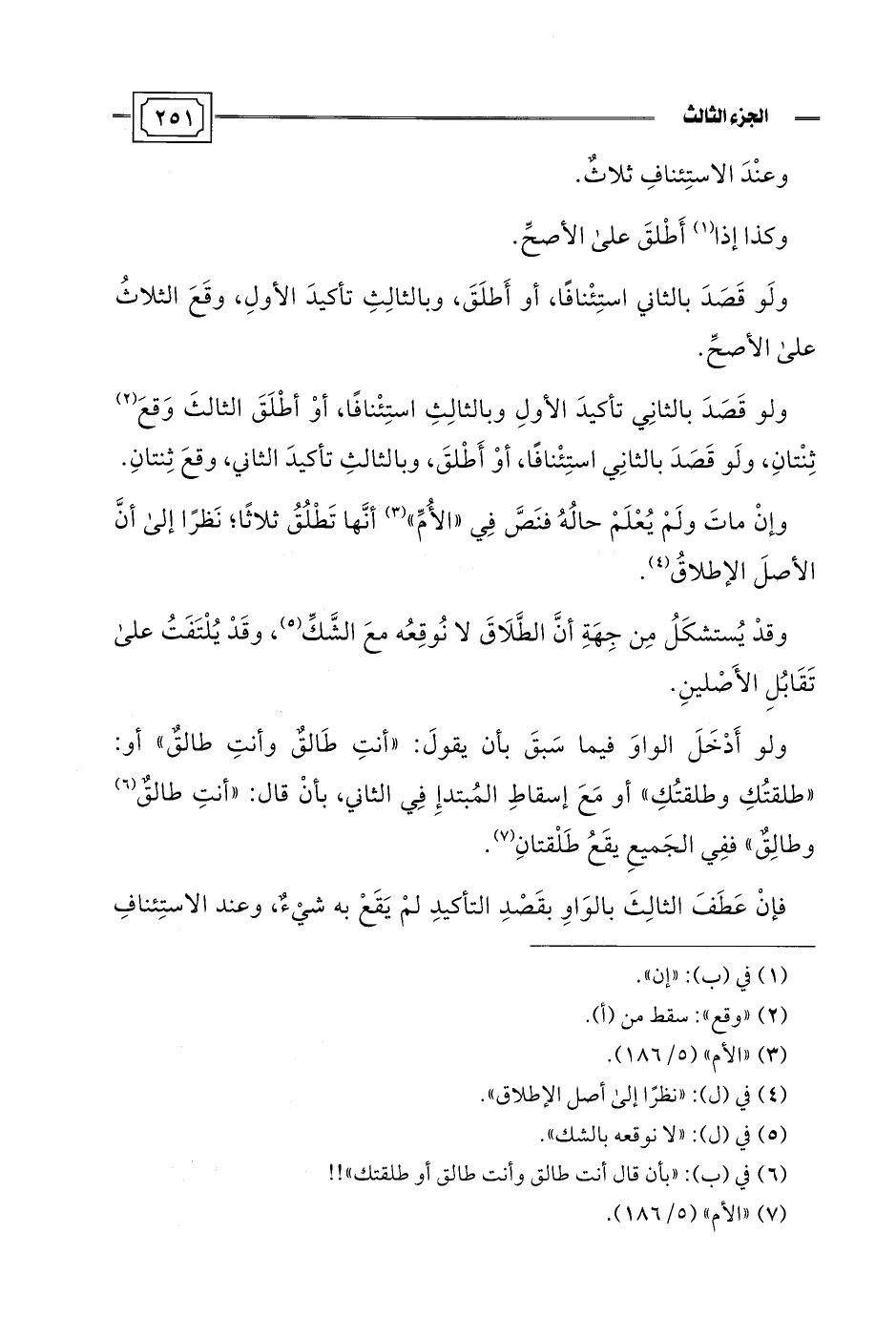 فإنْ عَطَفَ الثالِثَ بالوَاوِ بقَصْدِ التأكيدِ لمْ يَقَعْ به شيْءٌ، وعند الاستِئنافِ
