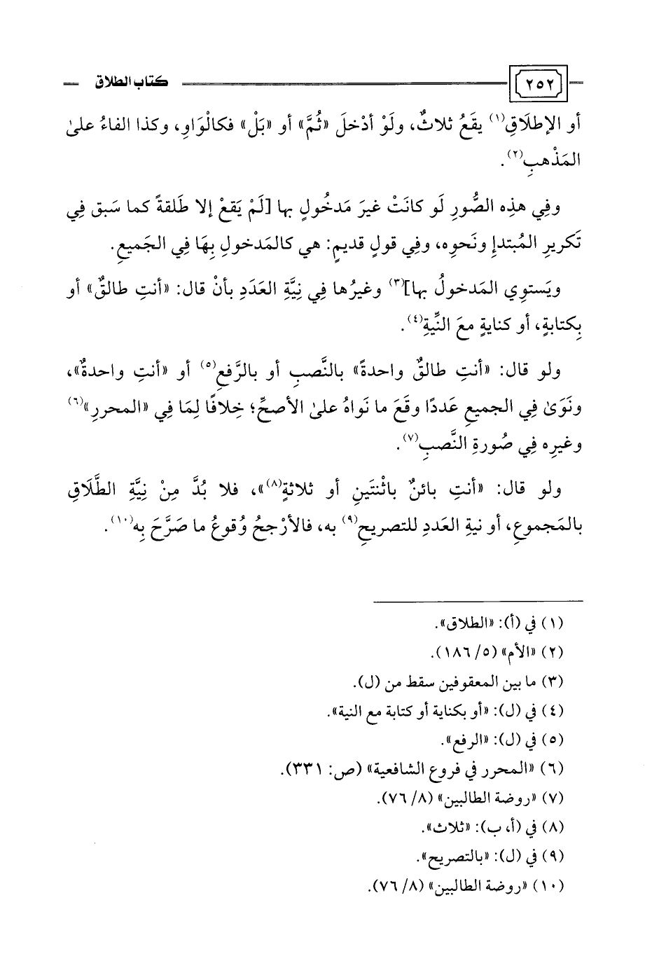 أو الإطلَاقِ (¬1) يقَعُ ثلاثٌ، ولَوْ أدْخلَ "ثُمَّ" أو "بَلْ" فكالْوَاوِ، وكذا الفاءُ على المَذْهبِ (¬2).