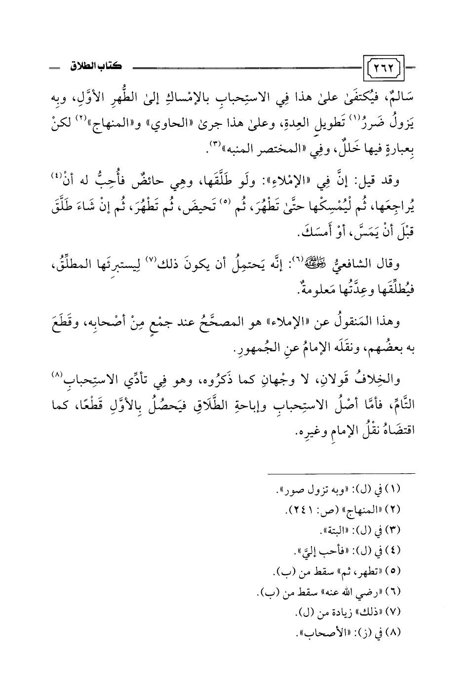 سَالمٌ، فيُكتفَى على هذا فِي الاستِحبابِ بالإمْساكِ إلى الطُّهرِ الأوَّلِ، وبِه يَزولُ ضَررُ (¬1) تَطويل العِدةِ، وعلى هذا جرى "الحاوي" و"المنهاج" (¬2) لكنْ بِعبارةٍ فيها خَللٌ، وفِي "المختصر المنبه" (¬3).