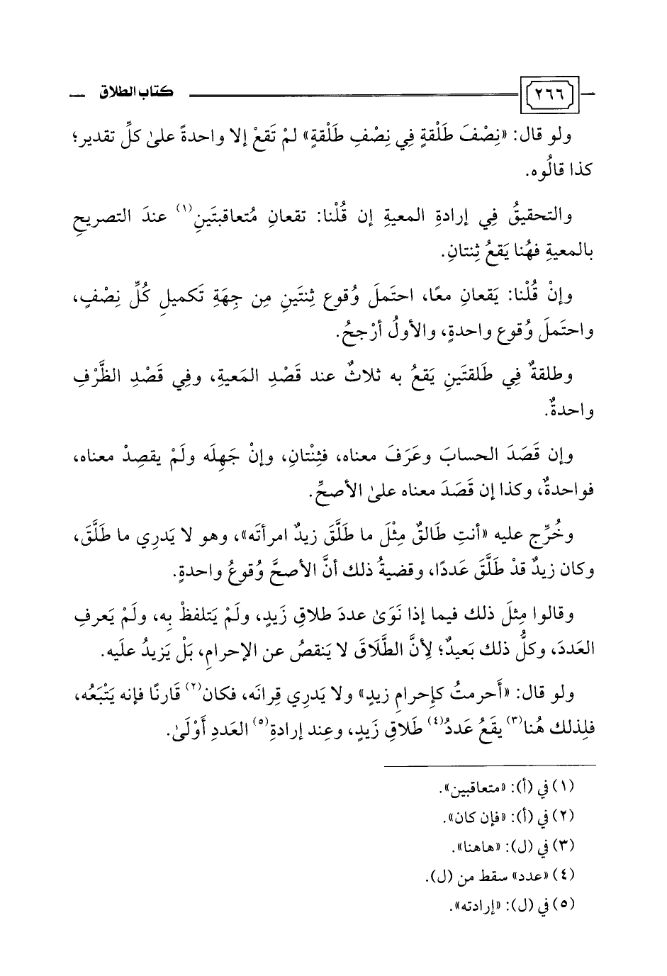 والتحقيقُ فِي إرادةِ المعيةِ إن قُلْنا: تقعانِ مُتعاقبتَينِ (¬1) عندَ التصريحِ بالمعيةِ فهُنا يَقعُ ثِنتانِ.