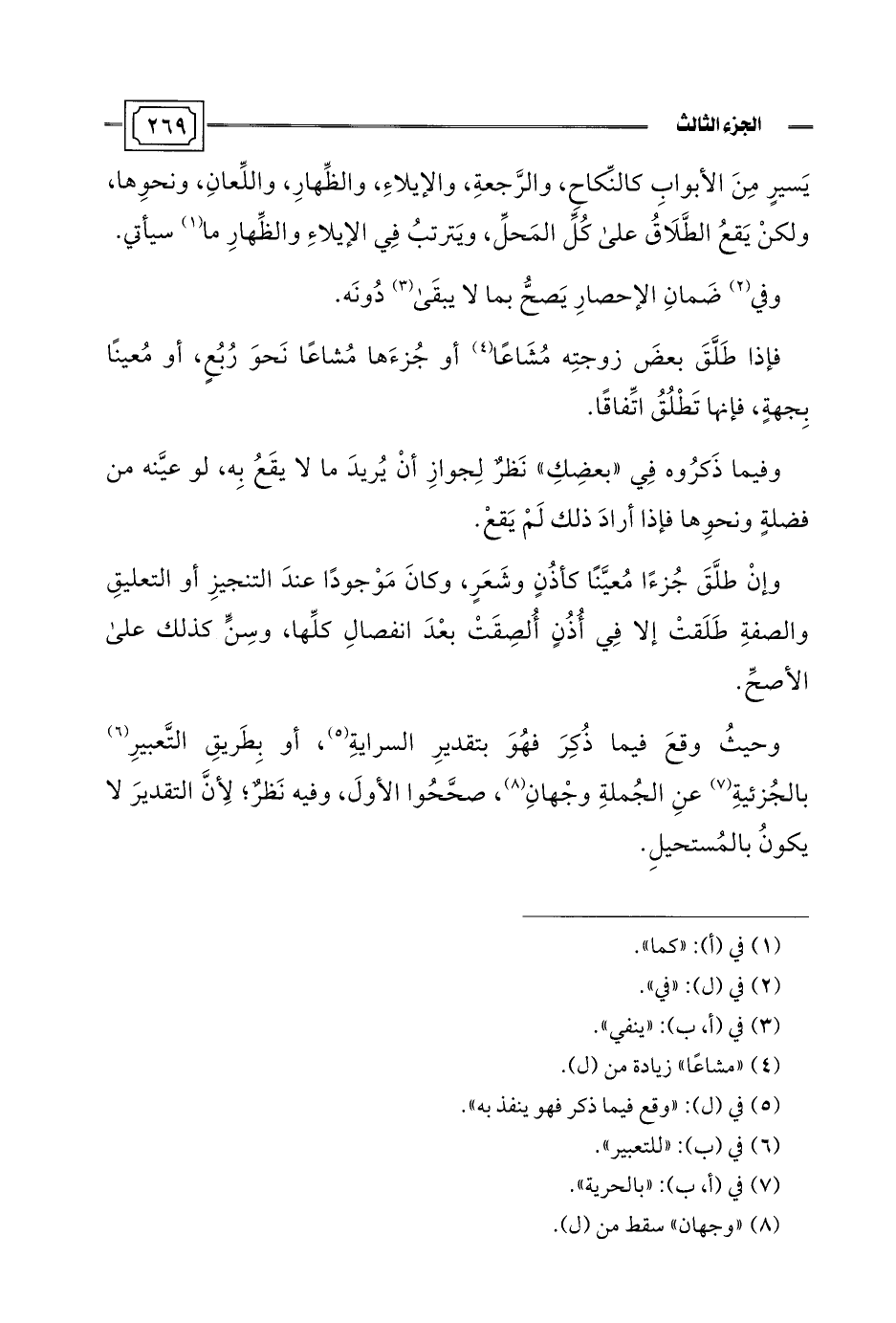 يَسيرٍ مِنَ الأبوابِ كالنِّكاح، والرَّجعةِ، والإيلاءِ، والظِّهارِ، واللِّعانِ، ونحوِها، ولكنْ يَقعُ الطَّلَاقُ على كُلِّ المَحلِّ، ويَترتبُ فِي الإيلاءِ والظِّهارِ ما (¬1) سيأتي.