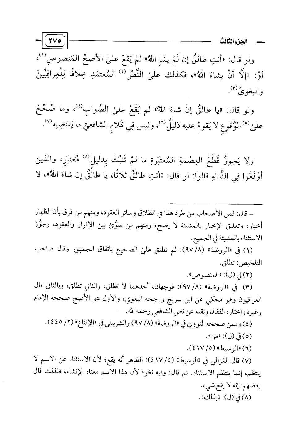 ولا يَجوزُ قَطْعُ العِصْمةِ المُعتبَرةِ ما لمْ تَثبُتْ بِدليلِ (¬8) مُعتبَرٍ، والذين أوْقَعُوا فِي النِّداءِ قالوا: لو قال: "أنتِ طالق ثلاثًا، يا طالَقُ إن شاءَ اللَّهُ"، لا