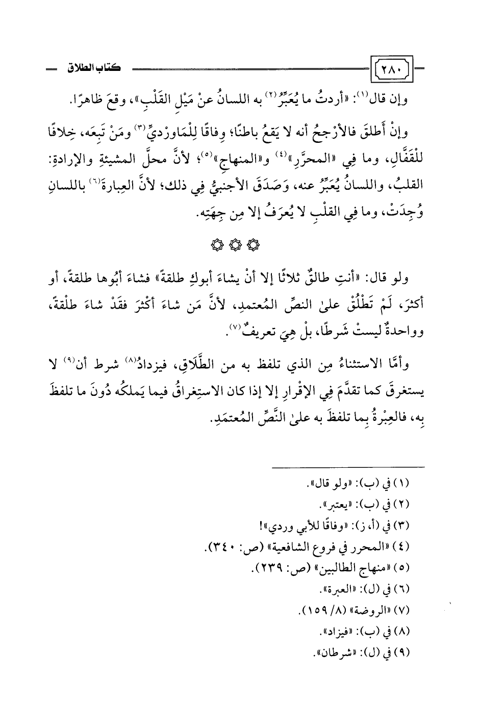 وأمَّا الاستثناءُ مِن الذي تلفظ به من الطَّلَاقِ، فيزدادُ (¬8) شرط أن (¬9) لا يستغرقَ كما تقدَّمَ فِي الإقْرارِ إلا إذا كان الاستِغراقُ فيما يَملكُه دُونَ ما تلفظَ بِه، فالعِبْرةُ بِما تلفظَ به على النَّصِّ المُعتمَدِ.
