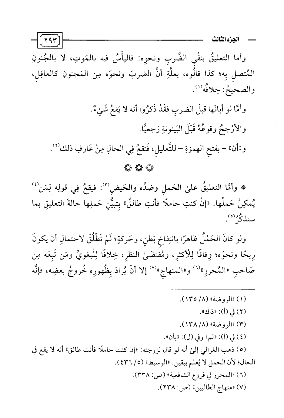 * وأمَّا التعليقُ على الحَملِ وضدِّه والحَيضِ (¬3): فيقعُ فِي قولِه لِمَن (¬4) يُمكِنُ حَملُها: "إنْ كنتِ حاملًا فأنتِ طالقٌ" بِتبيُّنِ حَملِها حالةَ التعليقِ بما سنذكُرُ (¬5).