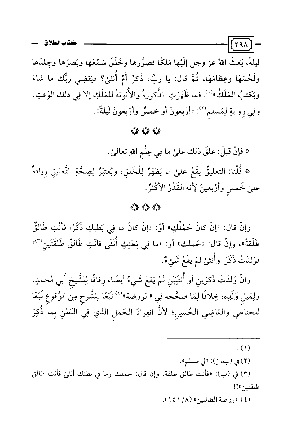 ليلةً، بَعثَ اللَّهُ عز وجل إلَيْها مَلكًا فصوَّرها وخَلَقَ سَمْعَها وبَصرَها وجِلدَها ولَحْمَهَا وعِظامَهَا، ثُمَّ قال: يا ربِّ، ذَكرٌ أَمْ أُنثَى؟ فيَقضِي ربُّك ما شاءَ ويَكتبُ المَلَكُ" (¬1). فما ظَهَرَتِ الذُّكورةُ والأُنوثةُ للمَلَكِ إلا فِي ذلك الوَقتِ، وفِي رِوايةٍ لِمُسلمٍ (¬2): "أرْبعونَ أو خمسٌ وأرْبعونَ لَيلةً".