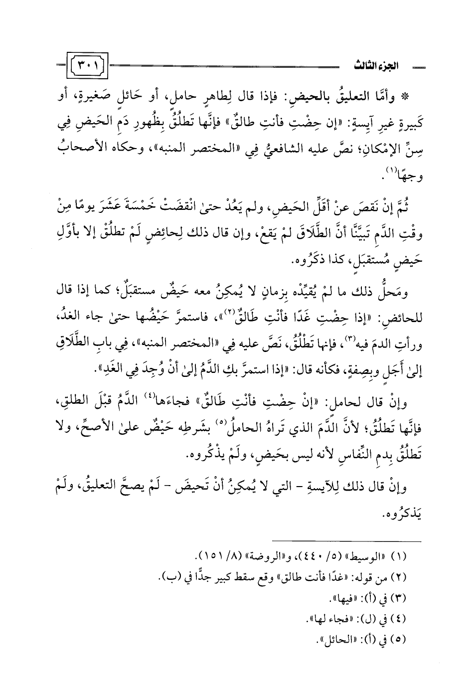 * وأمَّا التعليقُ بالحيضِ: فإذا قال لِطاهرٍ حاملٍ، أو حَائلٍ صَغيرةٍ، أو كَبيرةٍ غيرِ آيِسةٍ: "إن حِضْتِ فأنتِ طالقٌ" فإنَّها تَطلُقُ بِظُهورِ دَمِ الحَيضِ فِي سِنِّ الإمْكانِ؛ نصَّ عليه الشافعيُّ فِي "المختصر المنبه"، وحكاه الأصحابُ وجهًا (¬1).