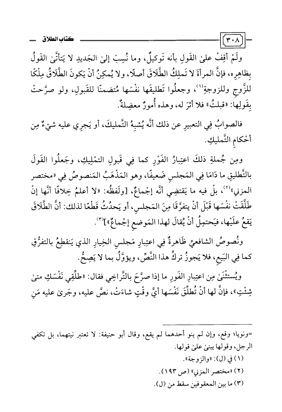 ومِن جُملةِ ذلكَ اعتِبارُ الفَوْرِ كما فِي قَبولِ التمْلِيكِ، وجَعلُوا القَولَ بالتَّطليقِ ما دَامَا فِي المَجلسِ ضَعيفًا، وهو المَذْهَبُ المَنصوصُ فِي "مختصر المزني" (¬2)، بلْ فيه ما يَقتضِي أنَّه إجْماعٌ، [ولَفظُه: "لا أعلمُ خِلافًا أنَّها إنْ طَلَّقَتْ نفْسَها قَبْلَ أَنْ يتفرَّقَا مِنَ المَجلسِ، أو يَحدُثُ قَطْعًا لذلك: أنَّ الطَّلَاقَ يَقعُ علَيْها، فيَحتمِلُ أَنْ يُقالَ لهذا المَوضعِ إجْماعٌ"] (¬3).