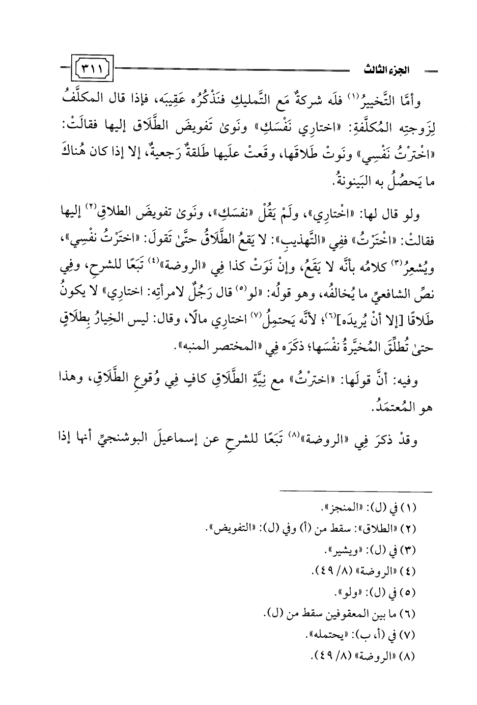 وفيه: أنَّ قولَها: "اخترْتُ" مع نِيَّةِ الطَّلَاقِ كافٍ فِي وُقوعِ الطَّلَاقِ، وهذا هو المُعتمَدُ.