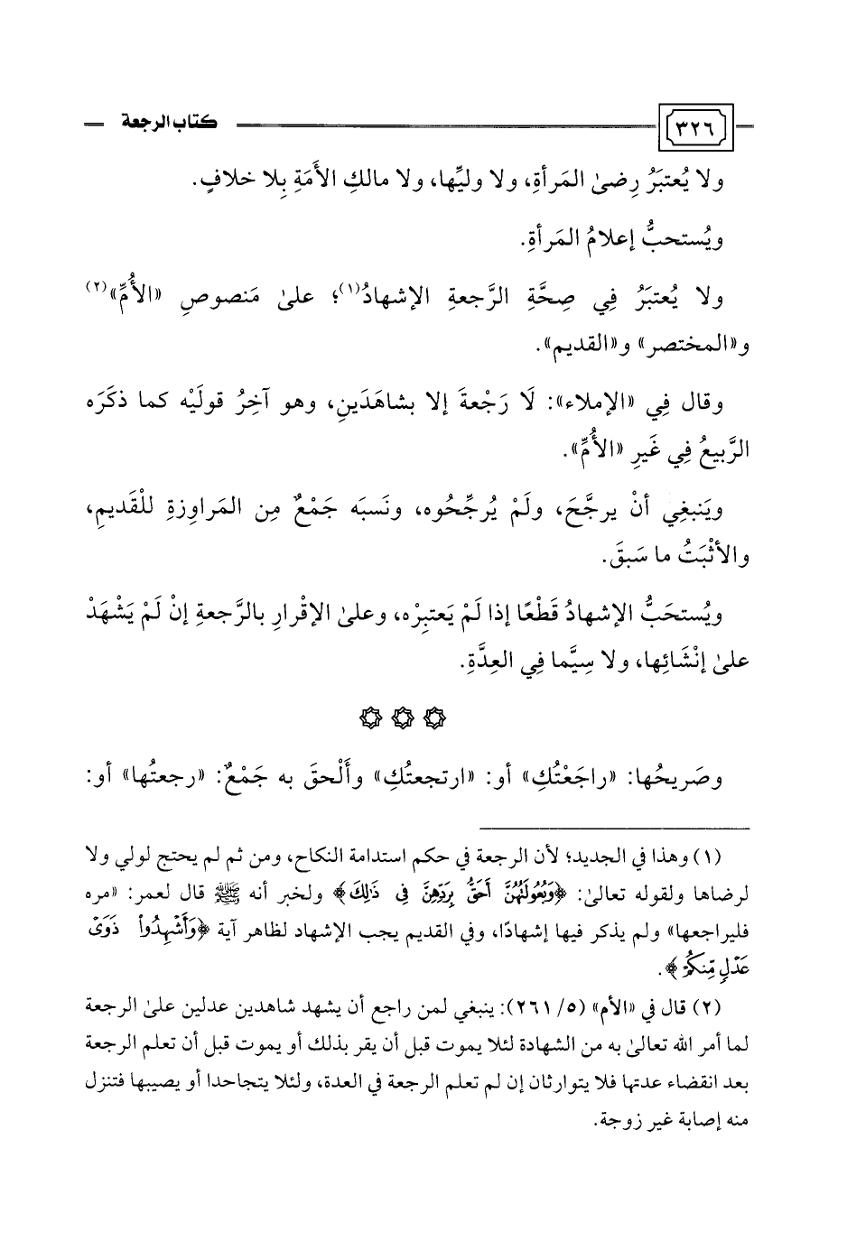 (¬2) قال في "الأم" (5/ 261): ينبغي لمن راجع أن يشهد شاهدين عدلين على الرجعة لما أمر اللَّه تعالى به من الشهادة لئلا يموت قبل أن يقر بذلك أو يموت قبل أن تعلم الرجعة بعد انقضاء عدتها فلا يتوارثان إن لم تعلم الرجعة في العدة، ولئلا يتجاحدا أو يصيبها فتنزل منه إصابة غير زوجة.