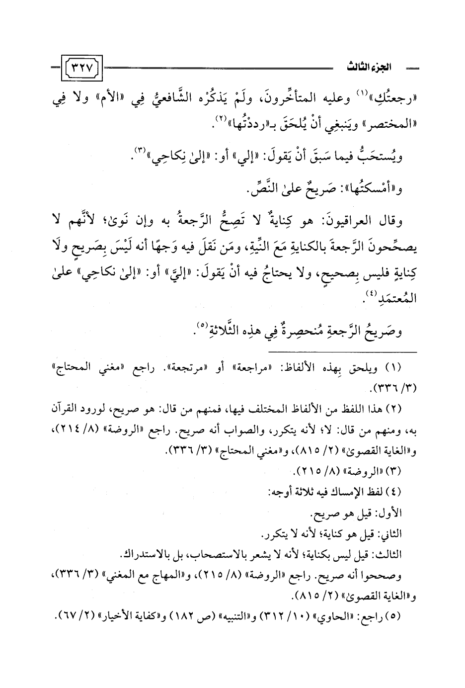 وقال العراقيونَ: هو كِنايةٌ لا تَصِحُّ الرَّجعةُ به وإن نَوى؛ لأنَّهم لا يصحِّحونَ الرَّجعةَ بالكنايةِ مَعَ النِّيةِ، ومَن نَقلَ فيه وَجهًا أنه لَيْسَ بِصَريحٍ ولَا كِنايةٍ فليس بِصحيحٍ، ولا يحتاجُ فيه أَنْ يَقولَ: "إليَّ" أو: "إلى نكاحِي" على المُعتمَدِ (¬4).