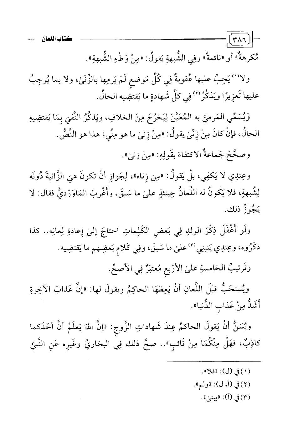 وعِندِي لا يَكفِي، بلْ يَقولُ: "مِن زِناه"، لِجَوازِ أَنْ تكونَ هيَ الزَّانيةَ دُونَه لِشُبهةٍ، فلا يَكونُ له اللِّعانُ حِينئذٍ على ما سَبقَ، وأَغْربَ المَاوَرْديُّ فقال: لا يَجُوزُ ذلك.