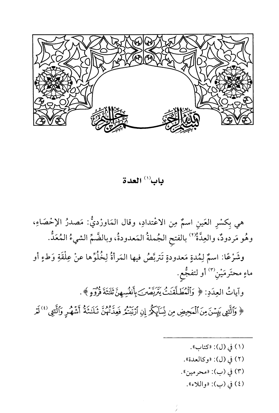 هي بِكسْرِ العَينِ اسمٌ مِن الاعْتدادِ، وقال المَاورْديُّ: مَصدرُ الإحْصَاءِ، وهُو مَردودٌ، والعِدَّة (¬2) بالفتحِ الجُملةُ المَعدودةُ، وبالضَّمِّ الشيءُ المُعَدُّ.