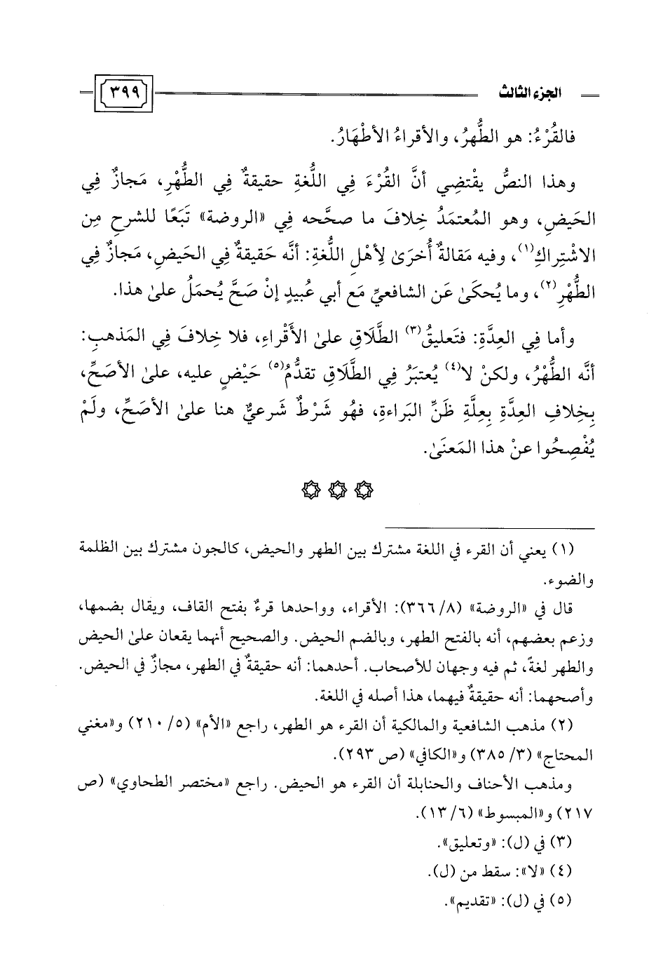 قال في "الروضة" (8/ 366): الأقراء، وواحدها قرءٌ بفتح القاف، ويقال بضمها، وزعم بعضهم، أنه بالفتح الطهر، وبالضم الحيف. والصحيح أنهما يقعان على الحيض والطهر لغةً، ثم فيه وجهان للأصحاب. أحدهما: أنه حقيقةٌ في الطهر، مجاز في الحيض. وأصحهما: أنه حقيقةٌ فيهما، هذا أصله في اللغة.