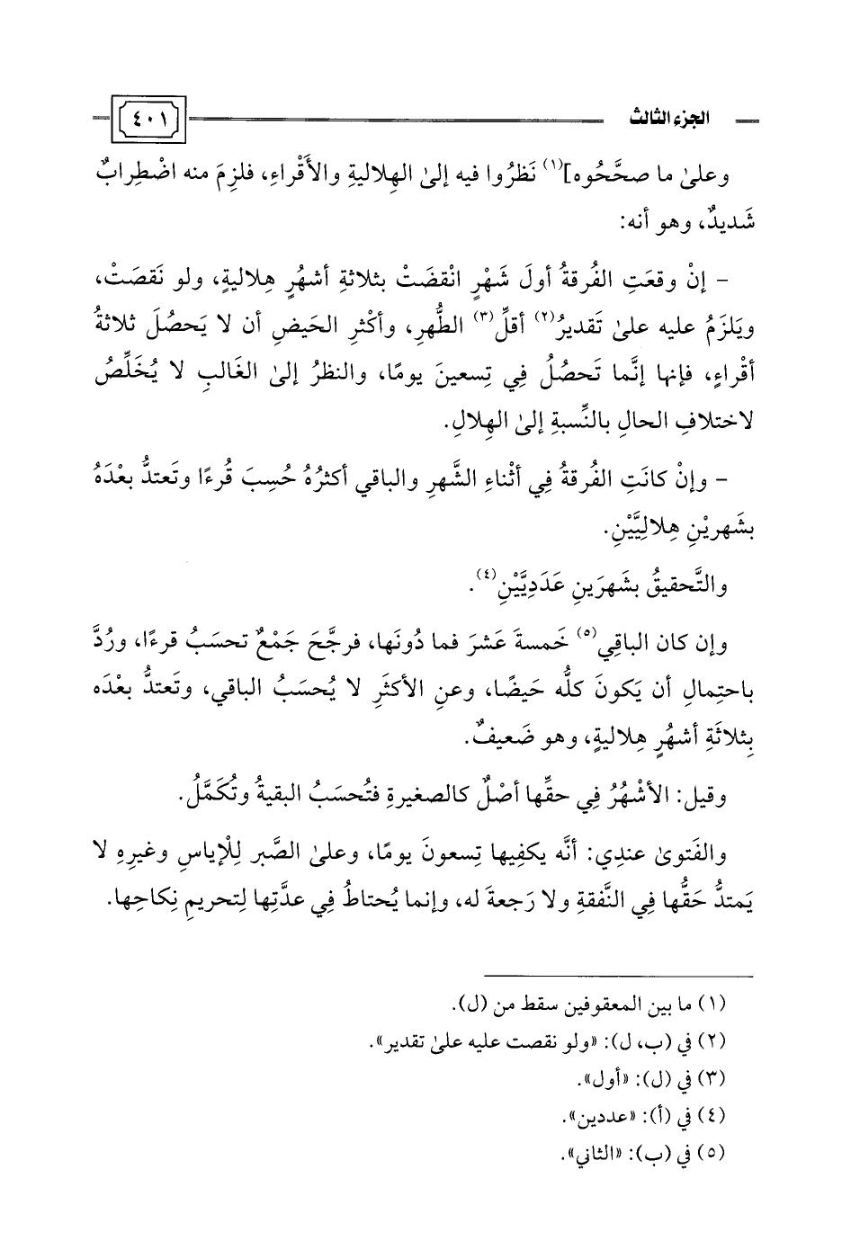 - إنْ وقعَتِ الفُرقةُ أولَ شَهْرٍ انْقضَتْ بثلاثةِ أشهُرٍ هِلاليةٍ، ولو نَقصتْ، ويَلزَمُ عليه على تَقديرُ (¬2) أقلِّ (¬3) الطُّهرِ، وأكْثرِ الحَيضِ أن لا يَحصُلَ ثلاثةُ أقْراءٍ، فإنها إنَّما تَحصلُ فِي تِسعينَ يومًا، والنظرُ إلى الغَالبِ لا يُخَلِّصُ لاختلافِ الحالِ بالنِّسبةِ إلى الهِلالِ.