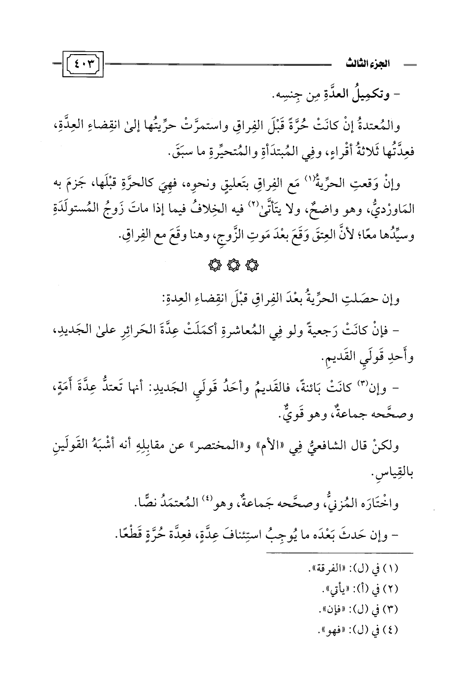 والمُعتدةُ إنْ كانَتْ حُرَّةً قَبْلَ الفِراقِ واستمرَّتْ حرِّيتُها إلى انقِضاءِ العِدَّةِ، فعِدَّتُها ثَلاثةُ أقْراءٍ، وفِي المُبتدَأةِ والمُتحيِّرةِ ما سبَقَ.