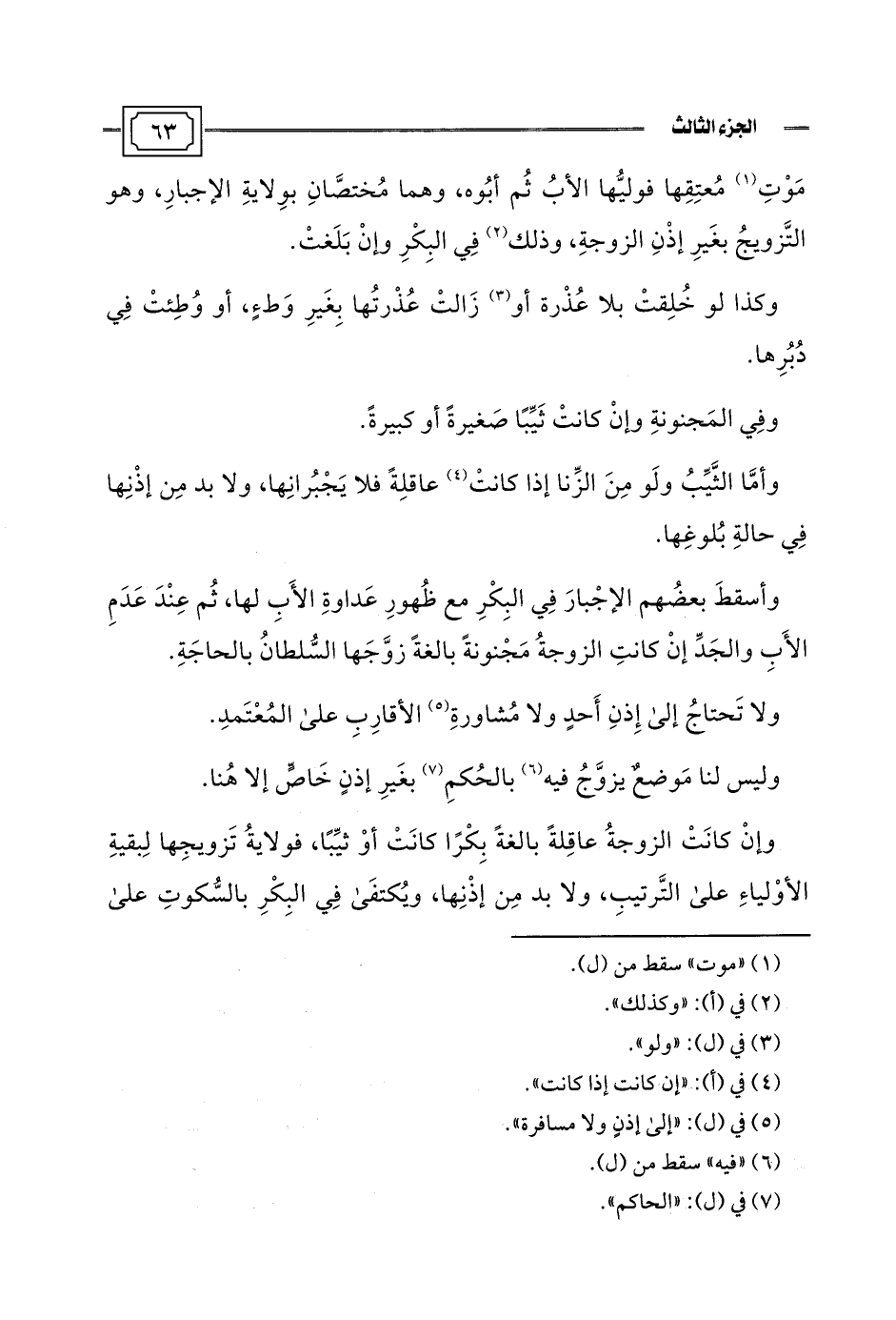 مَوْتِ (¬1) مُعتِمِها فوليُّها الأبُ ثُم أبُوه، وهما مُختصَّانِ بوِلايةِ الإجبارِ، وهو التَّزويجُ بغَيرِ إذْنِ الزوجةِ، وذلك (¬2) فِي البِكْرِ وإنْ بَلَغتْ.