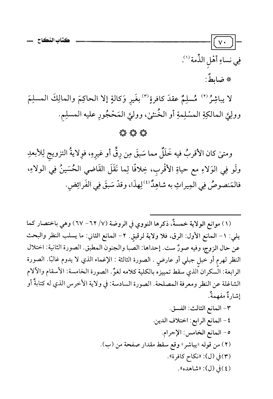 (¬1) موانع الولاية خمسةٌ، ذكرها النووي في الروضة (7/ 62 - 67) وهي باختصار كما يلي: