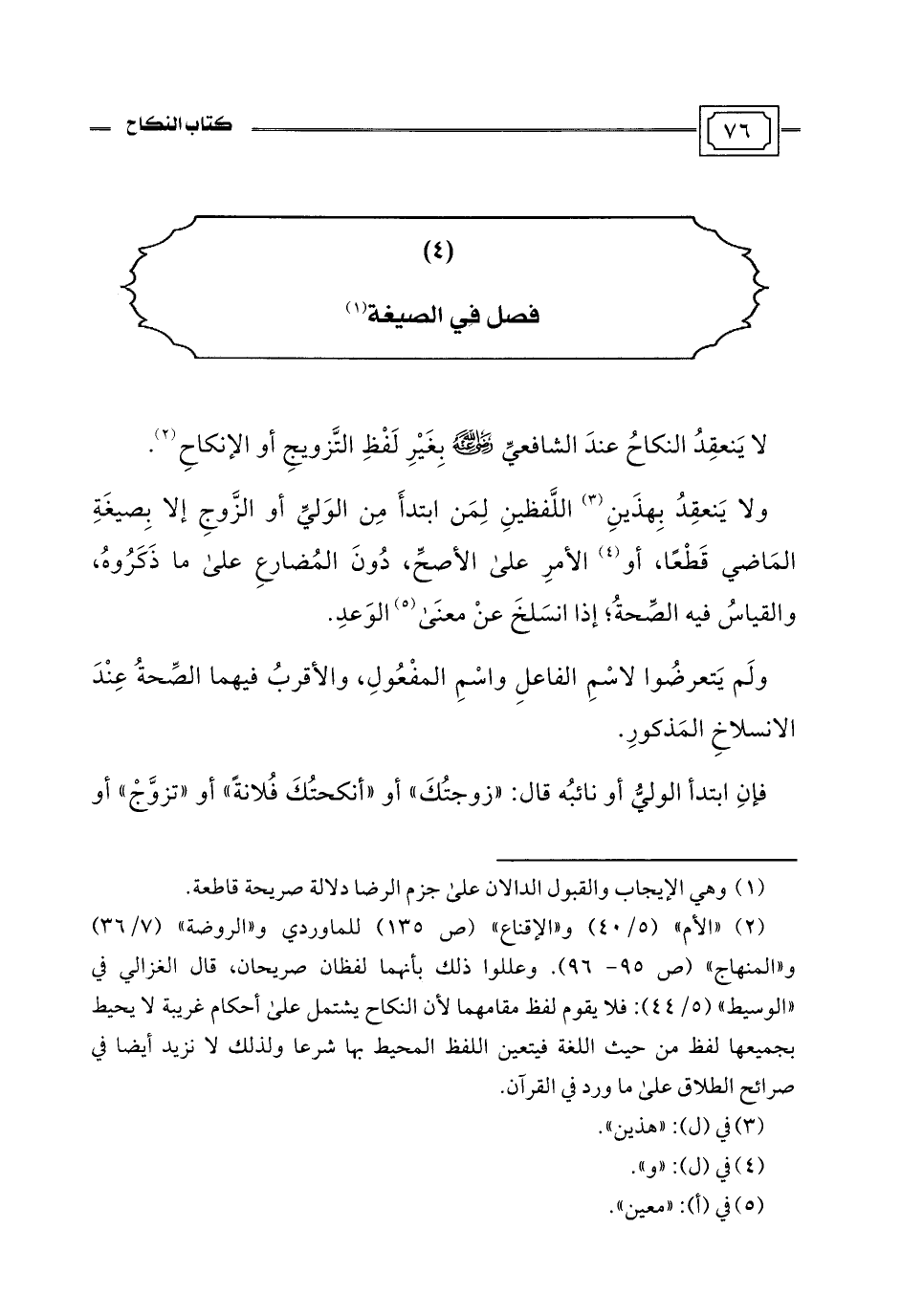 (¬2) "الأم" (5/ 40) و"الإقناع" (ص 135) للماوردي و"الروضة" (7/ 36) و"المنهاج" (ص 95 - 96). وعللوا ذلك بأنهما لفظان صريحان، قال الغزالي في "الوسيط" (5/ 44): فلا يقوم لفظ مقامهما لأن النكاح يشتمل على أحكام غريبة لا يحيط بجميعها لفظ من حيث اللغة فيتعين اللفظ المحيط بها شرعا ولذلك لا نزيد أيضًا في صرائح الطلاق على ما ورد في القرآن.