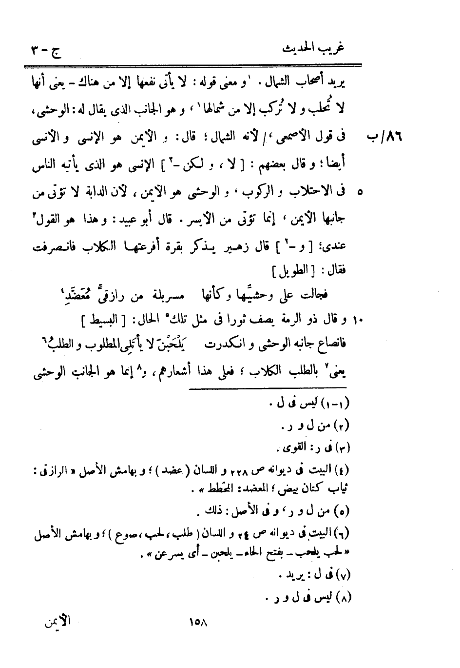 يُرِيد أَصْحَاب الشمَال. وَمعنى قَوْله: لَا يَأْتِي نَفعهَا إِلَّا من هُنَاكَ يَعْنِي أَنَّهَا لَا تُحلب وَلَا تُركب إِلَّا من شمالها وَهُوَ الْجَانِب الَّذِي يُقَال لَهُ: الوحشي 86 / ب فِي قَول الْأَصْمَعِي / لِأَنَّهُ الشمَال قَالَ: والأيمن هُوَ الْإِنْسِي والأنسي أَيْضا وَقَالَ بَعضهم: [لَا وَلَكِن -] الْإِنْسِي هوالذي يَأْتِيهِ النَّاس فِي الاحتلاب وَالرُّكُوب والوحشي هُوَ الْأَيْمن لِأَن الدَّابَّة لَا تُؤْتى من جَانبهَا الْأَيْمن إِنَّمَا تُؤْتى من الْأَيْسَر. قَالَ أَبُو عُبَيْدٍ: وَهَذَا هُوَ القَوْل عِنْدِي [و -] قَالَ زُهَيْر يذكر بقرة أفرعتها الْكلاب فَانْصَرَفت فَقَالَ: [الطَّوِيل]