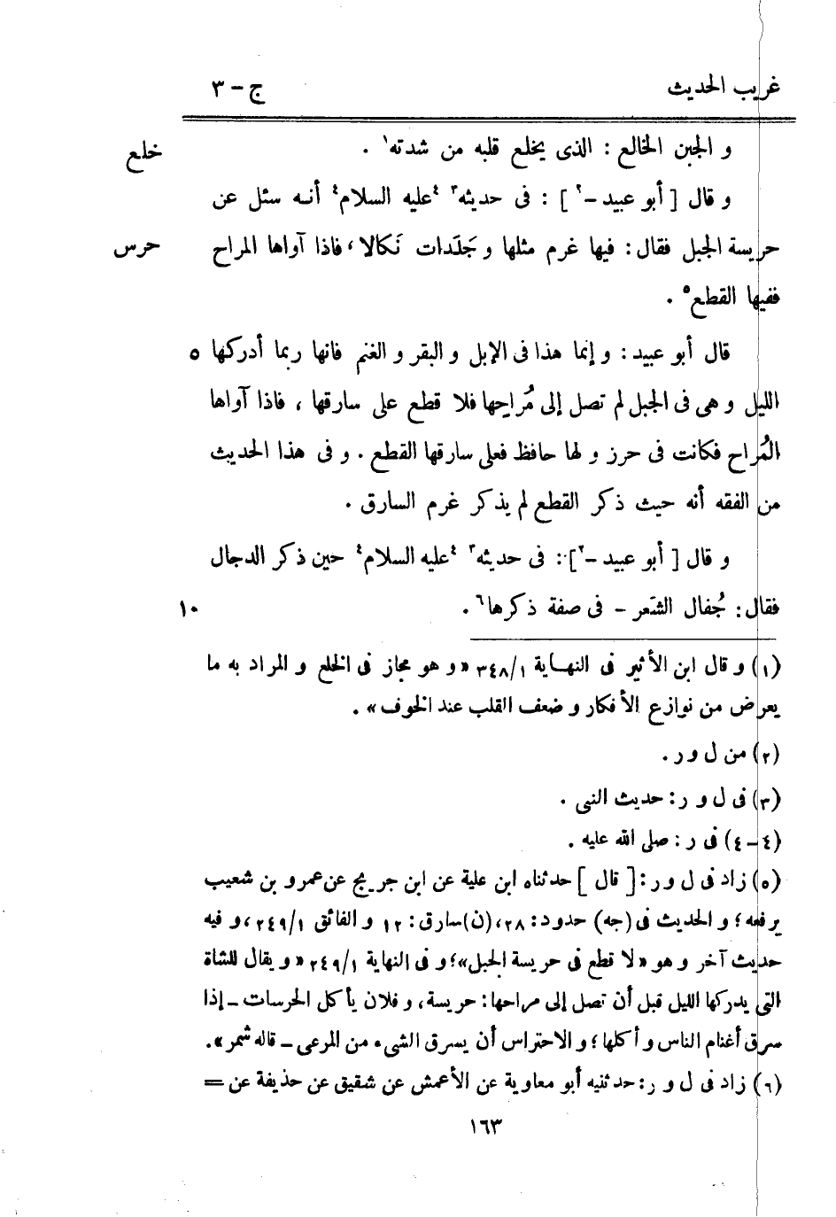 حُرِس وَقَالَ [أَبُو عُبَيْد -] : فِي حَدِيثه عَلَيْهِ السَّلَام أَنه سُئِلَ عَن حريسة الْجَبَل فَقَالَ: فِيهَا غرم مثلهَا وجَلَدات نَكالا فَإِذا آواها المراح فَفِيهَا الْقطع. قَالَ أَبُو عبيد: وَإِنَّمَا هَذَا فِي الْإِبِل وَالْبَقر وَالْغنم فَإِنَّهَا رُبمَا أدْركهَا اللَّيْل وَهِي فِي الْجَبَل لم تصل إِلَى مُراحِها فَلَا قطع على سارقها فَإِذا آواها المُراح فَكَانَت فِي حرز وَلها حَافظ فعلى سارقها الْقطع. وَفِي هَذَا الحَدِيث من الْفِقْه أَنه حَيْثُ ذكر الْقطع لم يذكر غرم السَّارِق.