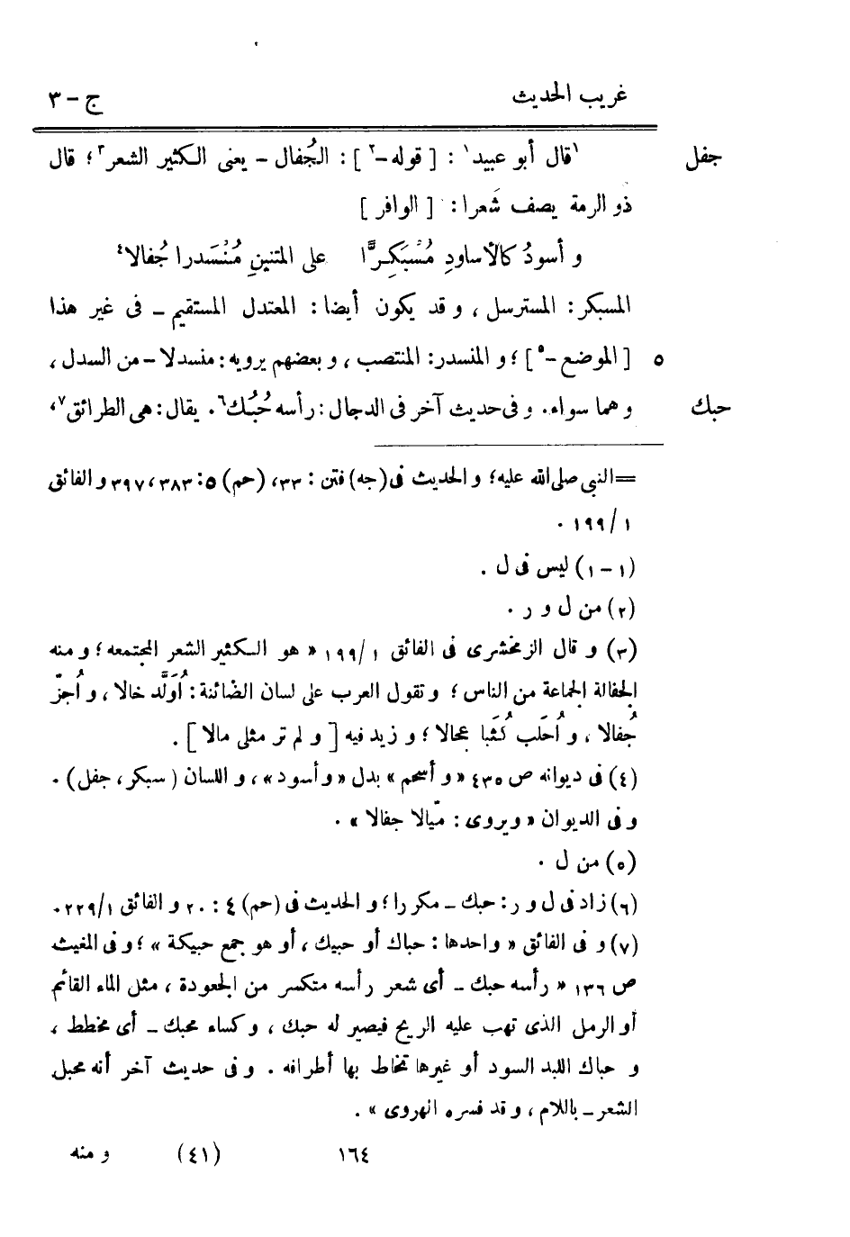 حبك قَالَ أَبُو عبيد: [قَوْله -] : الجُفال يَعْنِي الْكثير الشّعْر قَالَ ذُو الرمة يصف شعرًا: [الوافر]