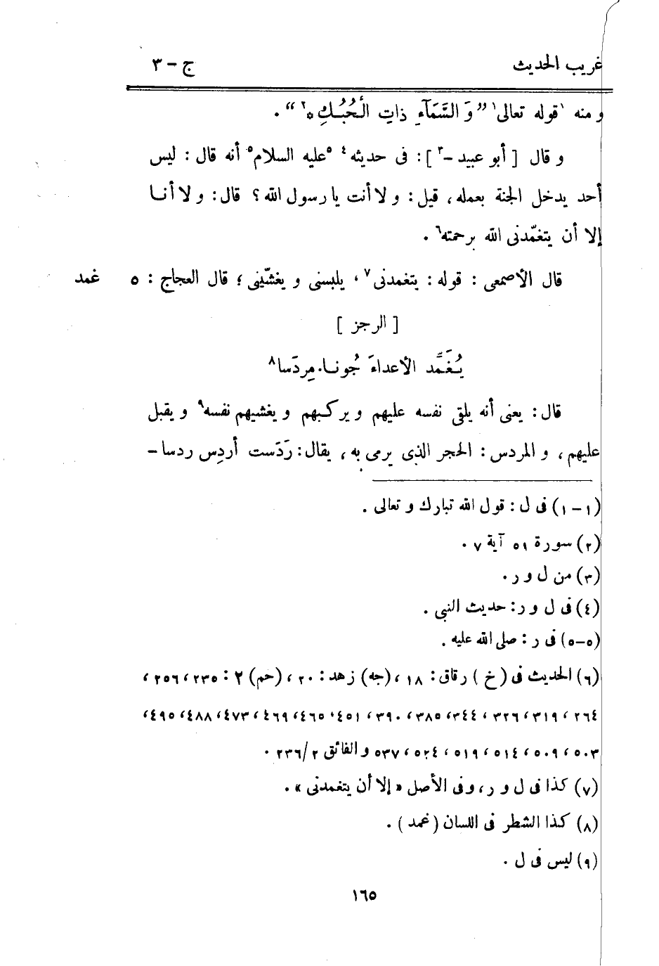 غمد وَقَالَ [أَبُو عُبَيْد -] : فِي حَدِيثه عَلَيْهِ السَّلَام أَنه قَالَ: لَيْسَ أحد يدْخل الْجنَّة بِعَمَلِهِ قيل: وَلَا أَنْت يَا رَسُول الله قَالَ: وَلَا أَنا إِلَّا أَن يتغمّدني اللَّه برحمته. قَالَ الْأَصْمَعِي: قَوْله: يتغمدني يلبسني ويغشّيني قَالَ العجاج: