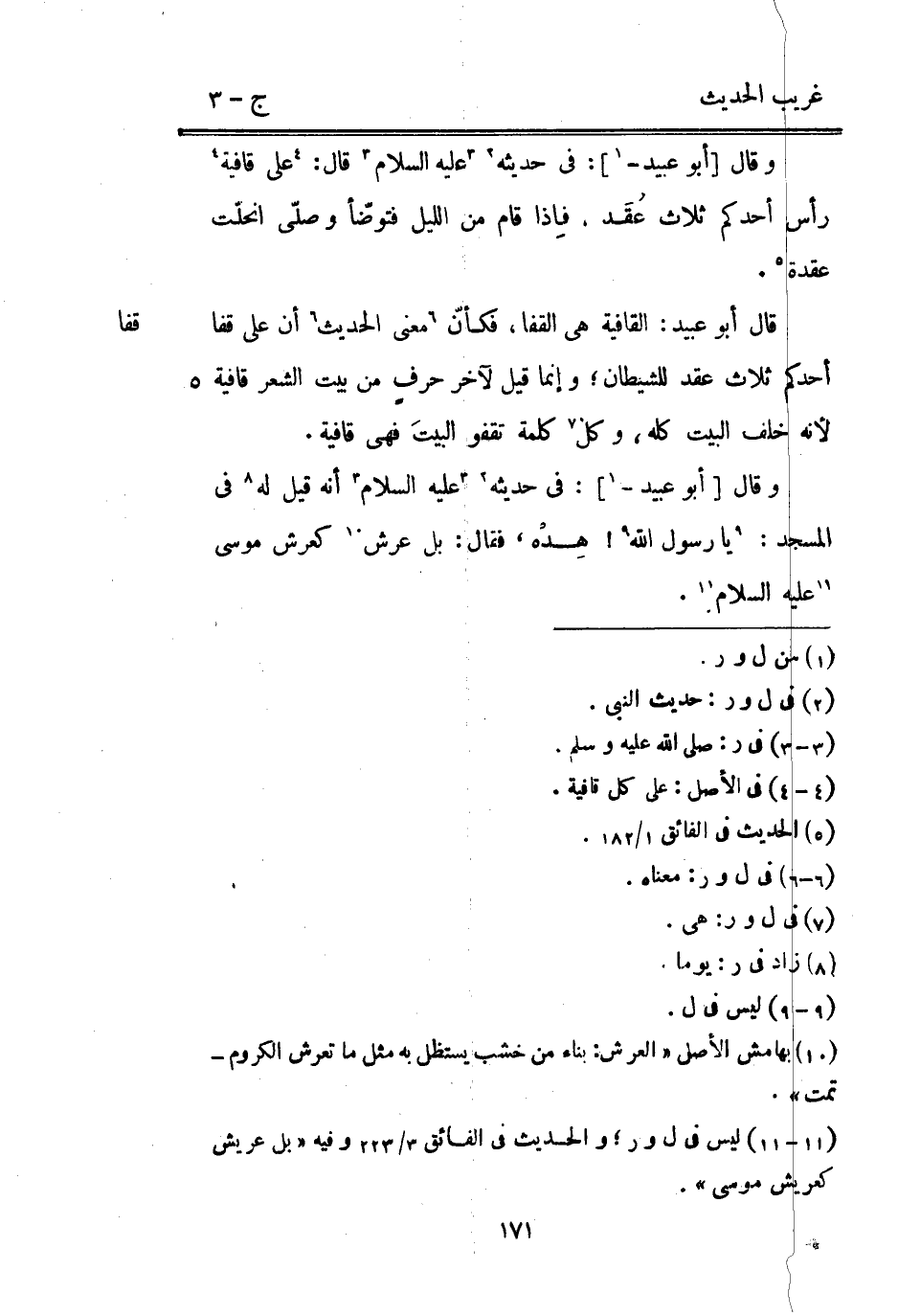 قفا قَالَ أَبُو عبيد: القافية هِيَ الْقَفَا فَكَأَن معنى الحَدِيث أَن على قفا أحدكُم ثَلَاث عقد للشَّيْطَان وَإِنَّمَا قيل لآخر حرفٍ من بَيت الشّعْر قافية لِأَنَّهُ خلف الْبَيْت كُله وكل كلمة تقفو الْبَيْت فَهِيَ قافية.