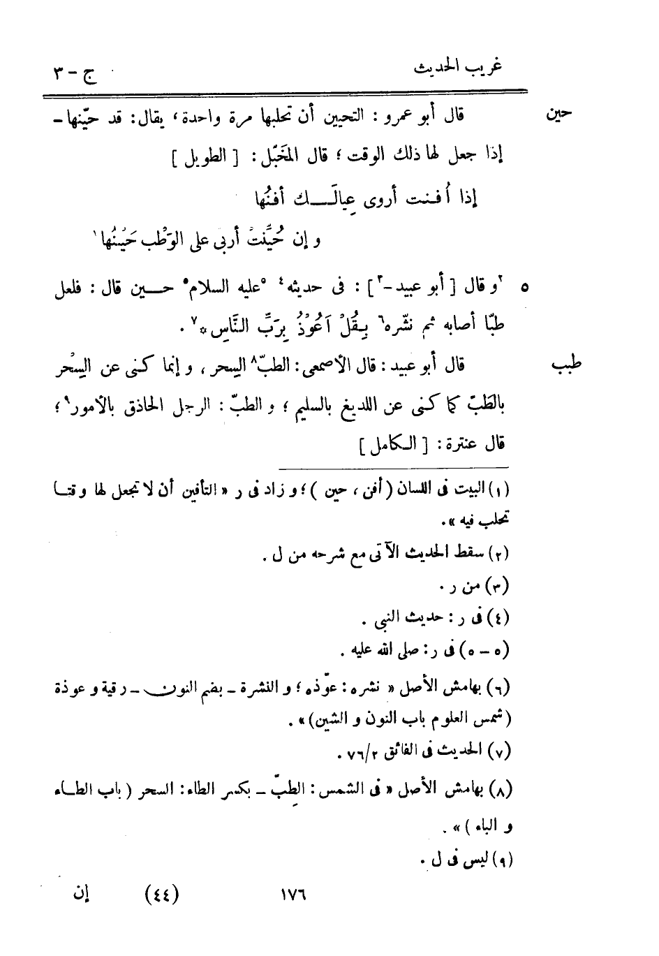 طبب وَقَالَ [أَبُو عُبَيْد -] : فِي حَدِيثه عَلَيْهِ السَّلَام حِين قَالَ: فَلَعَلَّ طِبًّا أَصَابَهُ ثمَّ نشّره بِقُلْ أَعُوْذُ بِرَبِّ النَّاسِ. قَالَ أَبُو عبيد: قَالَ الْأَصْمَعِي: الطبّ الِسحر وَإِنَّمَا كنى عَن السِحْر بالطَبّ كَمَا كنى عَن اللديغ بالسليم والطبّ: الرجل الحاذق بالأمور قَالَ عنترة: [الْكَامِل]