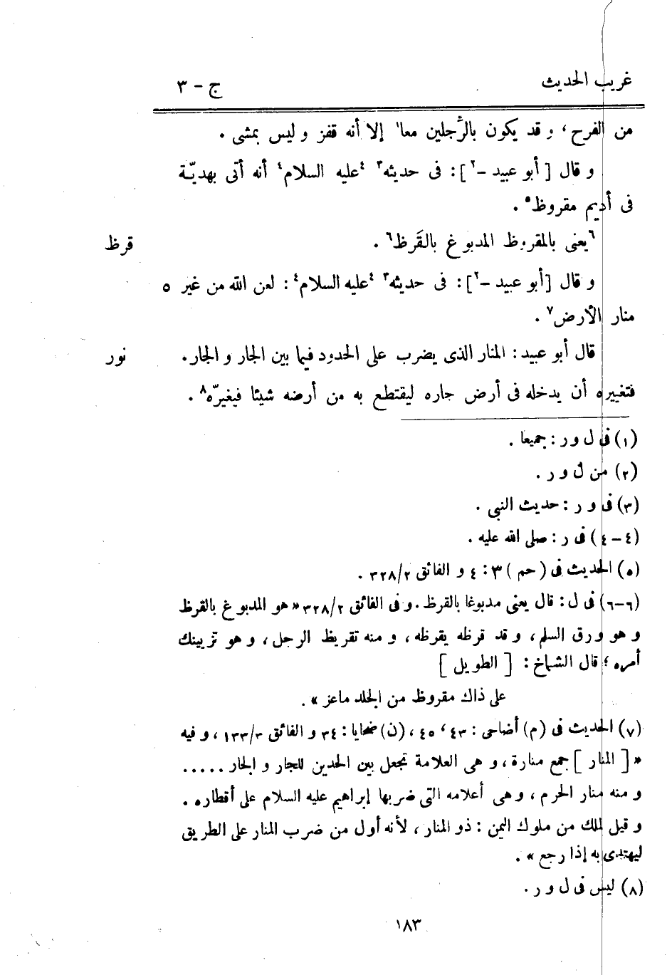 قرظ وَقَالَ [أَبُو عُبَيْد -] : فِي حَدِيثه عَلَيْهِ السَّلَام أَنه أَتَى بهديّة فِي أَدِيم مقروظ. يَعْنِي بالمقروظ المدبوغ بالقَرظ. وَقَالَ [أَبُو عُبَيْد -] : فِي حَدِيثه عَلَيْهِ السَّلَام: لعن اللَّه من غير منار الأَرْض.