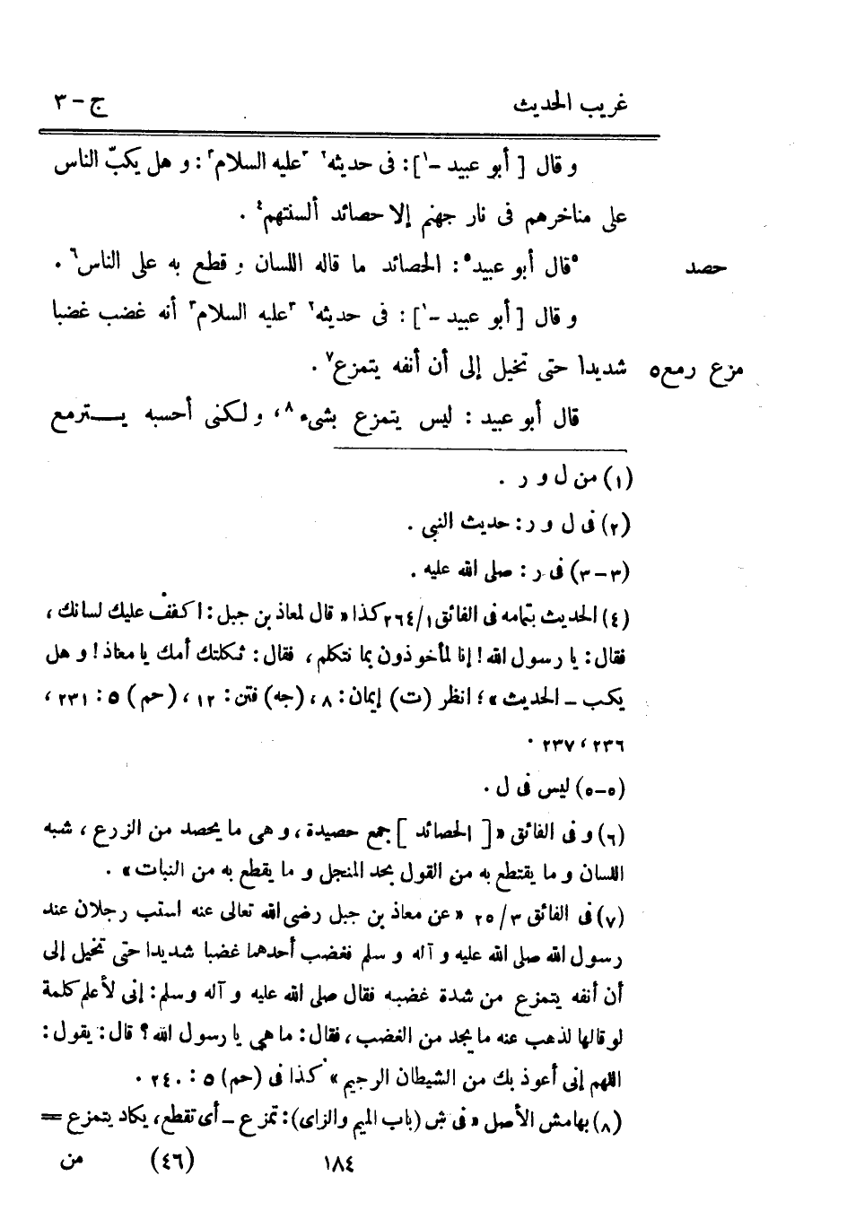 حصد وَقَالَ [أَبُو عُبَيْد -] : فِي حَدِيثه عَلَيْهِ السَّلَام: وَهل يكّب النَّاس على مناخرهم فِي نَار جَهَنَّم إِلَّا حصائد ألسنتهم. قَالَ أَبُو عبيد: الحصائد مَا قَالَه اللِّسَان وَقطع بِهِ على النَّاس.