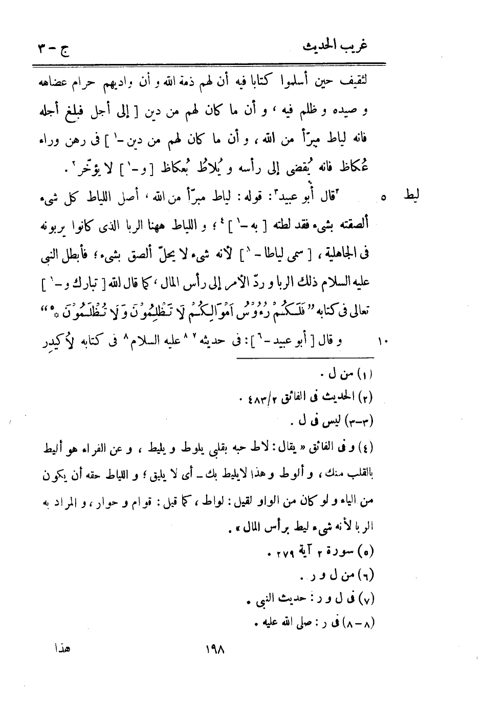 عدل فَرد حظر قَالَ أَبُو عبيد: قَوْله: لياط مبرّأ من اللَّه أصل اللياط كل شَيْء أَلْصَقته بِشَيْء فقد لطته [بِهِ -] واللياط هَهُنَا الرِّبَا الَّذِي كَانُوا يربونه فِي الْجَاهِلِيَّة [سمي لياطا -] لِأَنَّهُ شَيْء لَا يحلّ ألصق بِشَيْء فَأبْطل النَّبِي عَلَيْهِ السَّلَام ذَلِك الرِّبَا وردّ الْأَمر إِلَى رَأس المَال كَمَا قَالَ الله [تبَارك و -] تَعَالَى فِي كِتَابه {فلكم رُؤُوس أمْوَالِكُمْ لَا تَظْلِمُوْنَ وَلاَ تُظْلَمُوْنَ} .