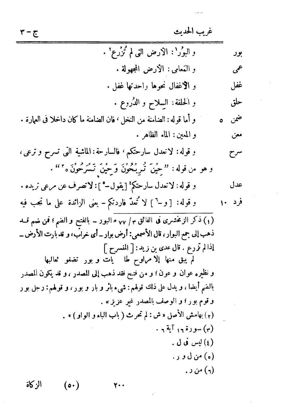 والبوُر: الأَرْض الَّتِي لم تُزْرع. والمَعامي: الأَرْض المجهولة. والأغفال نَحْوهَا واحدتها غفل. وَالْحَلقَة: السِلاح والدُروع. وَأما قَوْله: الضامنة من النّخل فَإِن الضامنة مَا كَانَ دَاخِلا فِي الْعِمَارَة. والمعين: المَاء الظَّاهِر. وَقَوله: لَا تعدل سارحتكم فالسارحة: الْمَاشِيَة الَّتِي تسرح وترعى وَهُوَ من قَوْله: {حِيْنَ تُرِيْحُوْنَ وَحِيْنَ تَسْرَحُوْنَ} . وَقَوله: لَا تعدل سارحتكم [يَقُول -] : لَا تصرف عَن مرعى تريده. وَقَوله: [و -] لَا تُعدّ فاردتكم يَعْنِي الزَّائِدَة على مَا تجب فِيهِ