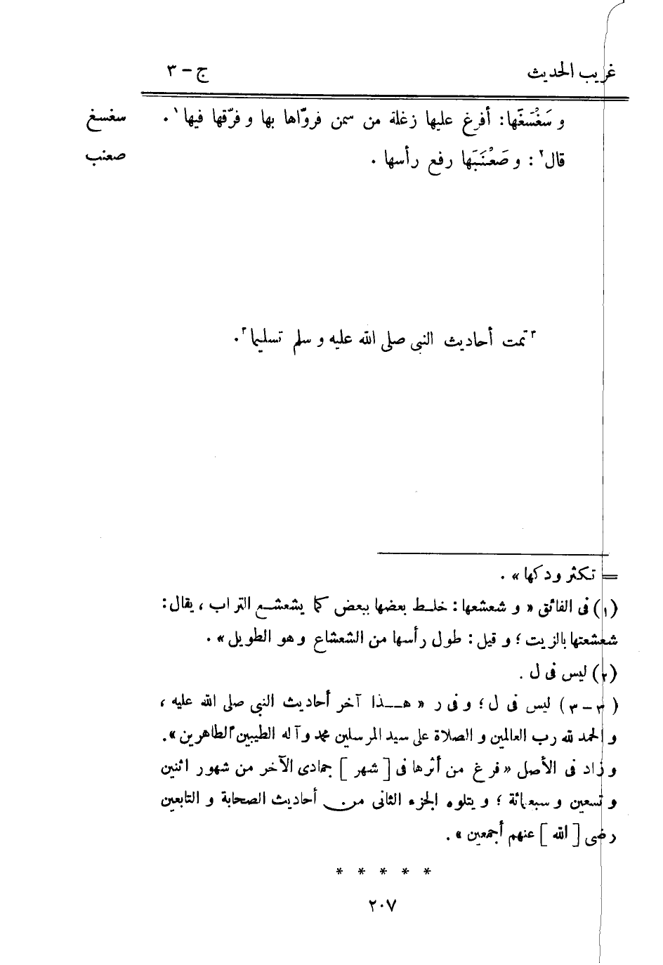 وسَغْسَغَها: أفرغ عَلَيْهَا زغلة من سمن فرواها بهَا وفرّقها فِيهَا. قَالَ: وصَعْنَبَها رفع رَأسهَا. تمت أَحَادِيث النَّبِيّ صلي الله عَلَيْهِ وَسلم تَسْلِيمًا.