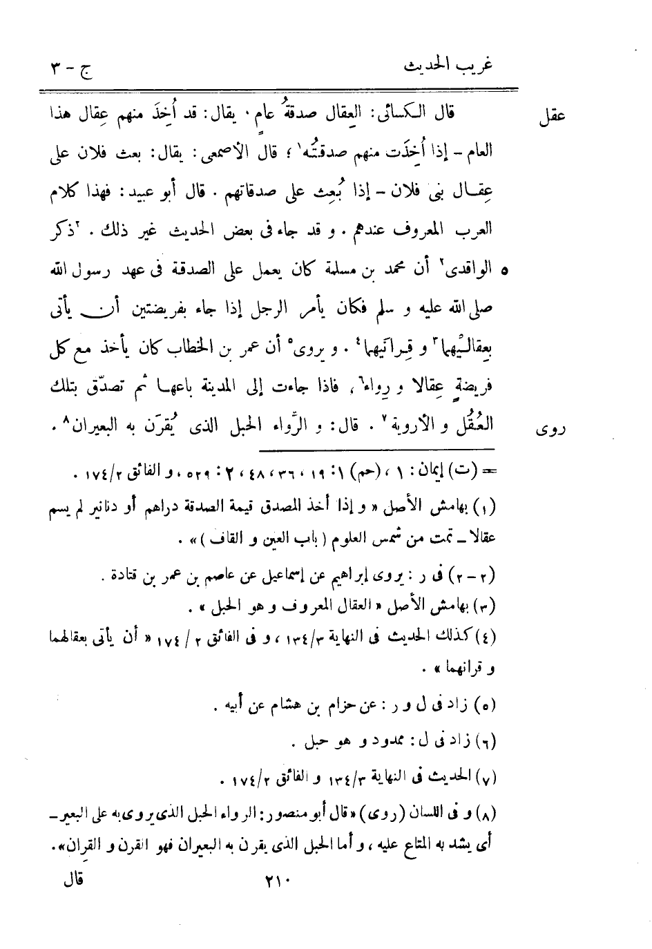 روى صَدَقَاتهمْ. قَالَ أَبُو عبيد: فَهَذَا كَلَام الْعَرَب الْمَعْرُوف عِنْدهم. وَقد جَاءَ فِي بعض الحَدِيث غير ذَلِك. ذكر الْوَاقِدِيّ أَن مُحَمَّد بن مسلمة كَانَ يعْمل على الصَّدَقَة فِي عهد رَسُول الله صلي اللَّه عَلَيْهِ وَسلم فَكَانَ يَأْمر الرجل إِذا جَاءَ بفريضتين أَن يَأْتِي بِعقاليْهما وقِرانَيهما. ويروى أَن عمر بن الْخطاب كَانَ يَأْخُذ مَعَ كل فريضةٍ عِقالا ورِواء فاذا جَاءَت إِلَى الْمَدِينَة بَاعهَا ثمَّ تصدّق بِتِلْكَ العُقُل والأروية. قَالَ: والرَّواء الْحَبل الَّذِي يقرن بِهِ البعيران.