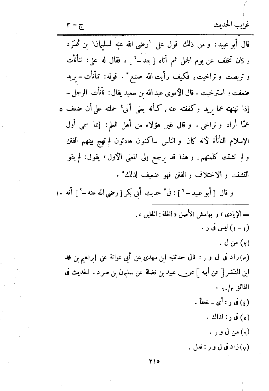 قَالَ أَبُو عبيد: وَمن ذَلِك قَول عَليّ رَضِي الله عَنهُ لِسُلَيْمَان بن صُرَد وَكَانَ تخلف عَن يَوْم الْجمل ثمَّ أَتَاهُ [بعد -] فَقَالَ لَهُ عَليّ: تنأنأت وتربصت وتراخيت فَكيف رَأَيْت الله صنع. قَوْله: تنأنأت يُرِيد ضعفت واسترخيت. قَالَ الْأمَوِي عبد الله بن سعيد يُقَال: نأنأت الرجل إِذا نهنهته عَمَّا يُرِيد وكففته عَنهُ كَأَنَّهُ يَعْنِي أَنِّي حَملته على أَن ضعف عمّا أَرَادَ وتراخي. وَقَالَ غير هَؤُلَاءِ من أهل الْعلم: إِنَّمَا سمي أول الْإِسْلَام النأنأة لِأَنَّهُ كَانَ وَالنَّاس ساكنون هادئون لم تهج بَينهم الْفِتَن وَلم تشَتت كلمتهم وَهَذَا قد يرجع إِلَى الْمَعْنى الأول يَقُول: لم يَقُول التشتت وَالِاخْتِلَاف والفتن فَهُوَ ضَعِيف لذَلِك.